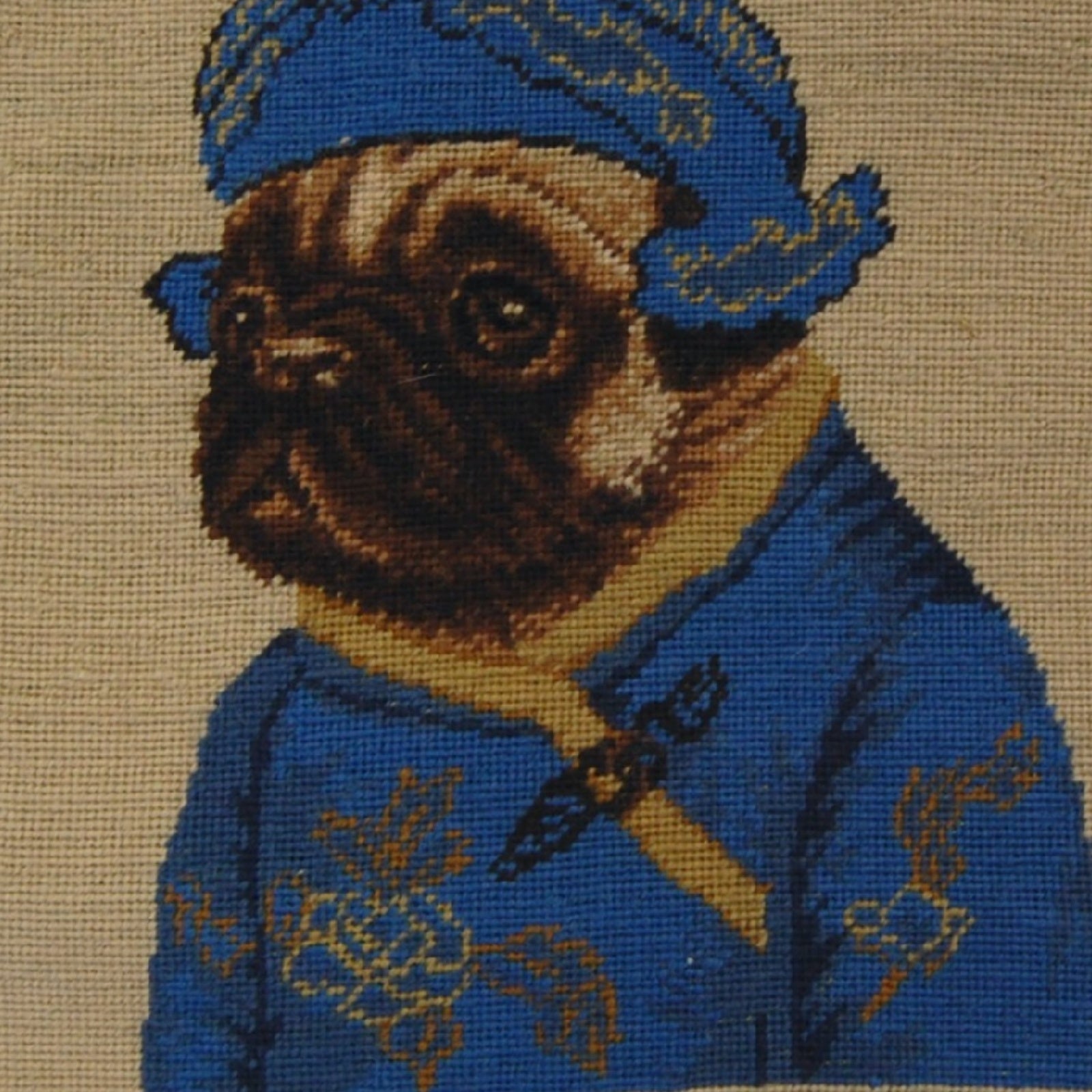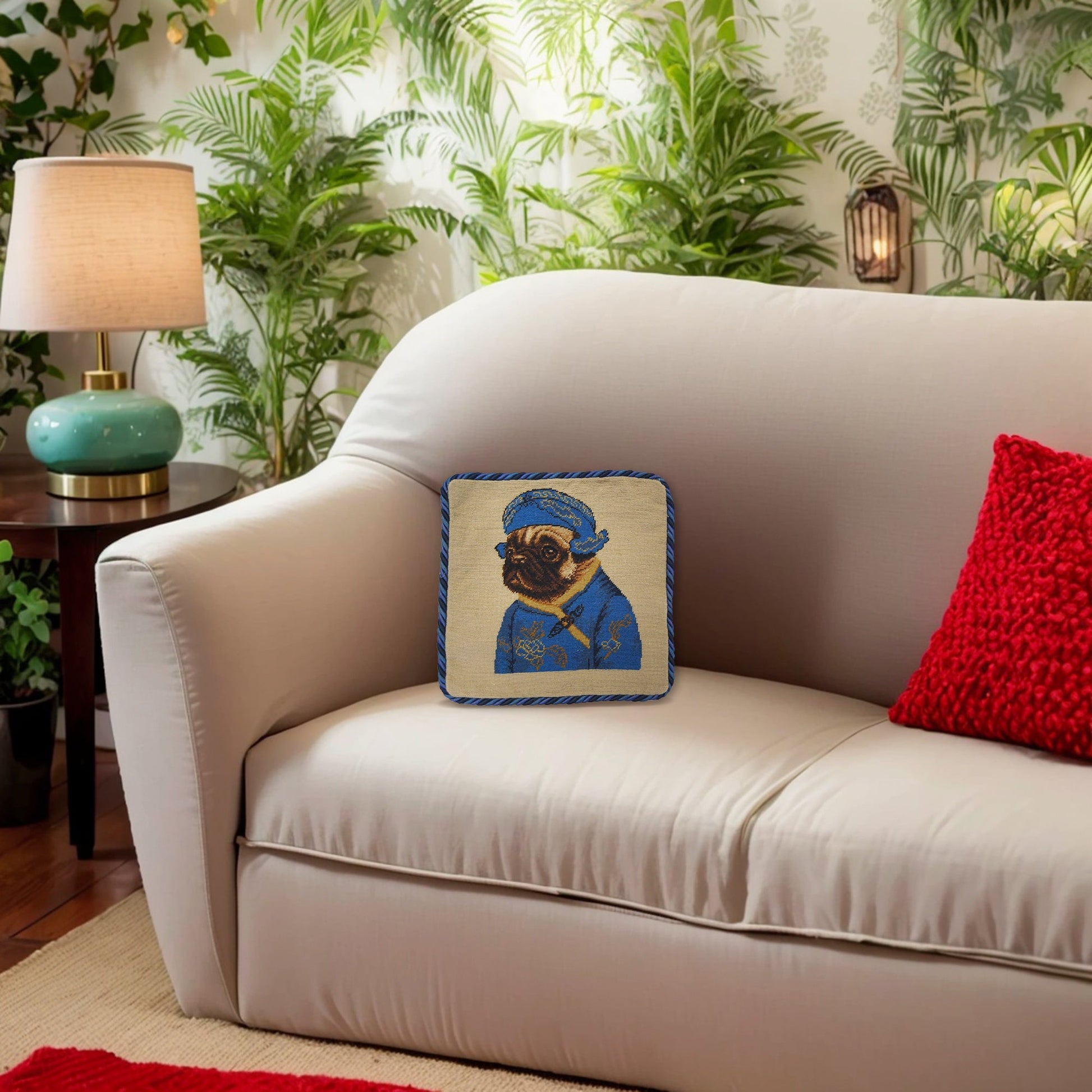 Handmade Wool Needlepoint Pillow Cover - Decorative Throw Cushion Cover - Vintage Floral Embroidery Design pug boy in blue with 3 color cording