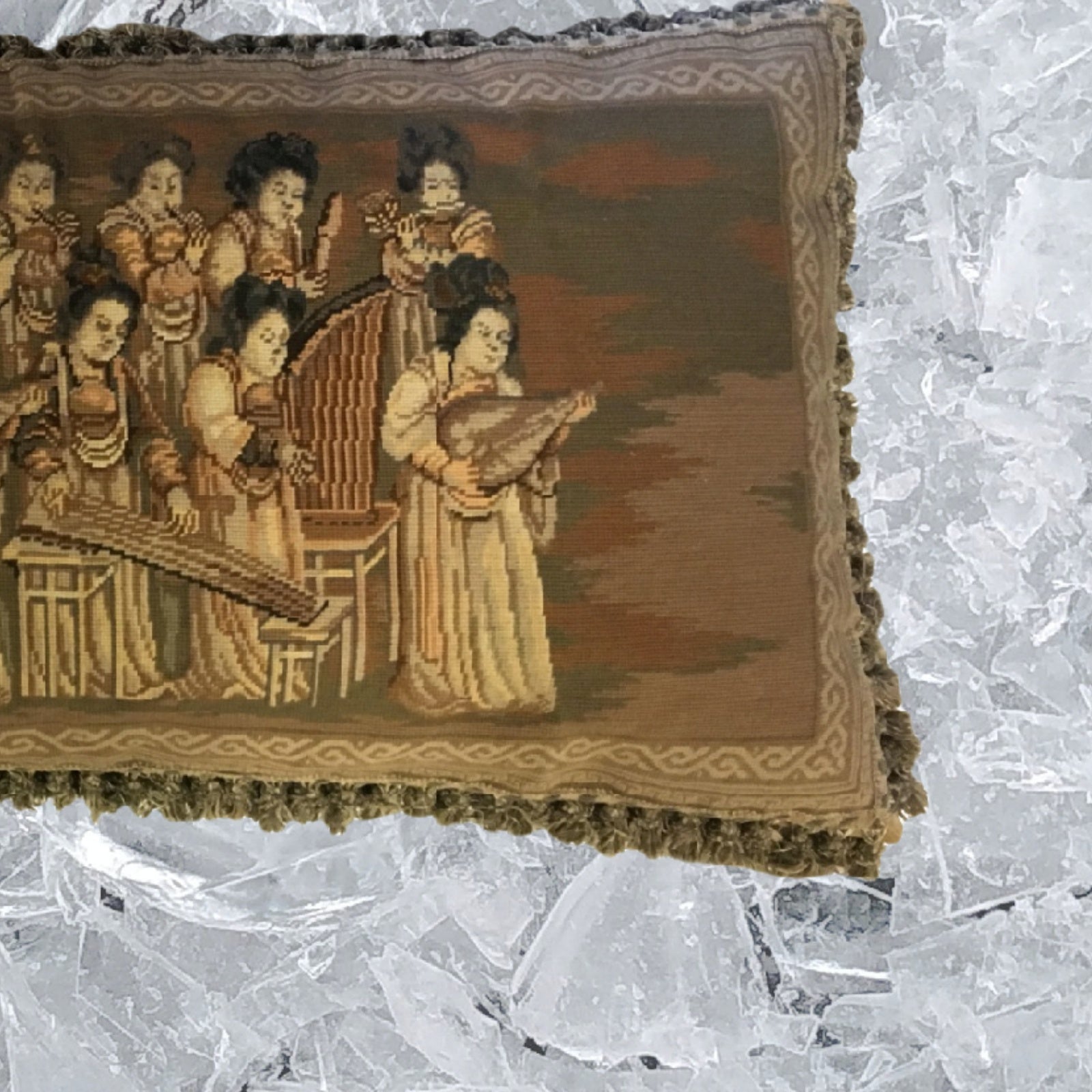 Handmade Wool Needlepoint Pillow Cover - Decorative Throw Cushion Cover - Vintage Floral Embroidery Design musician ladies from China old silk road painting with tassels 1