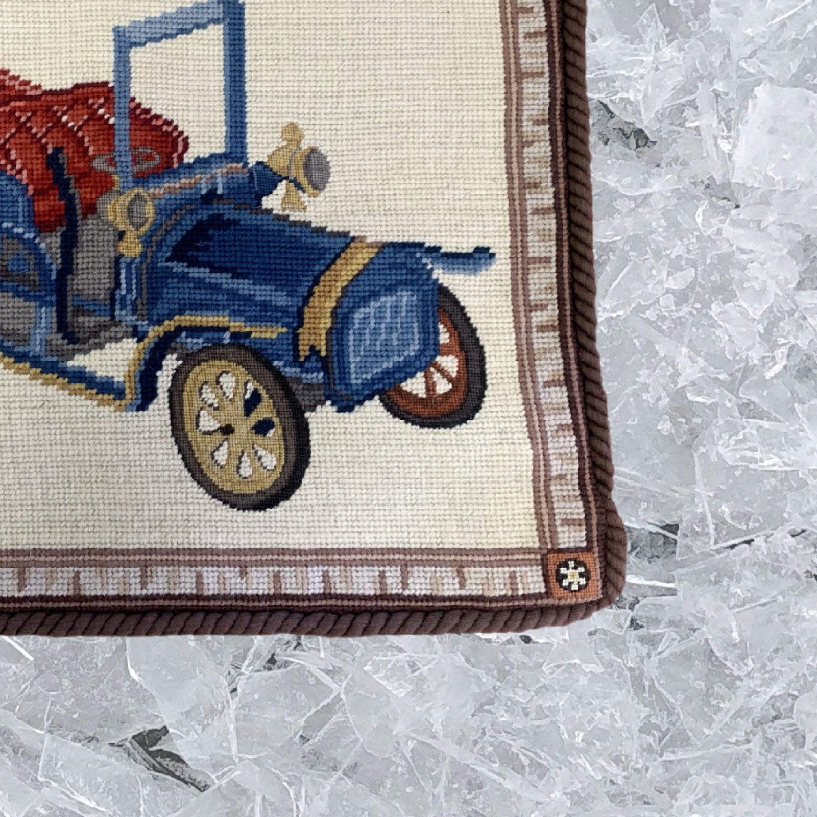 Handmade Wool Needlepoint Pillow Cover - Decorative Throw Cushion Cover - Vintage Floral Embroidery Design blue/red wagon with brown cording