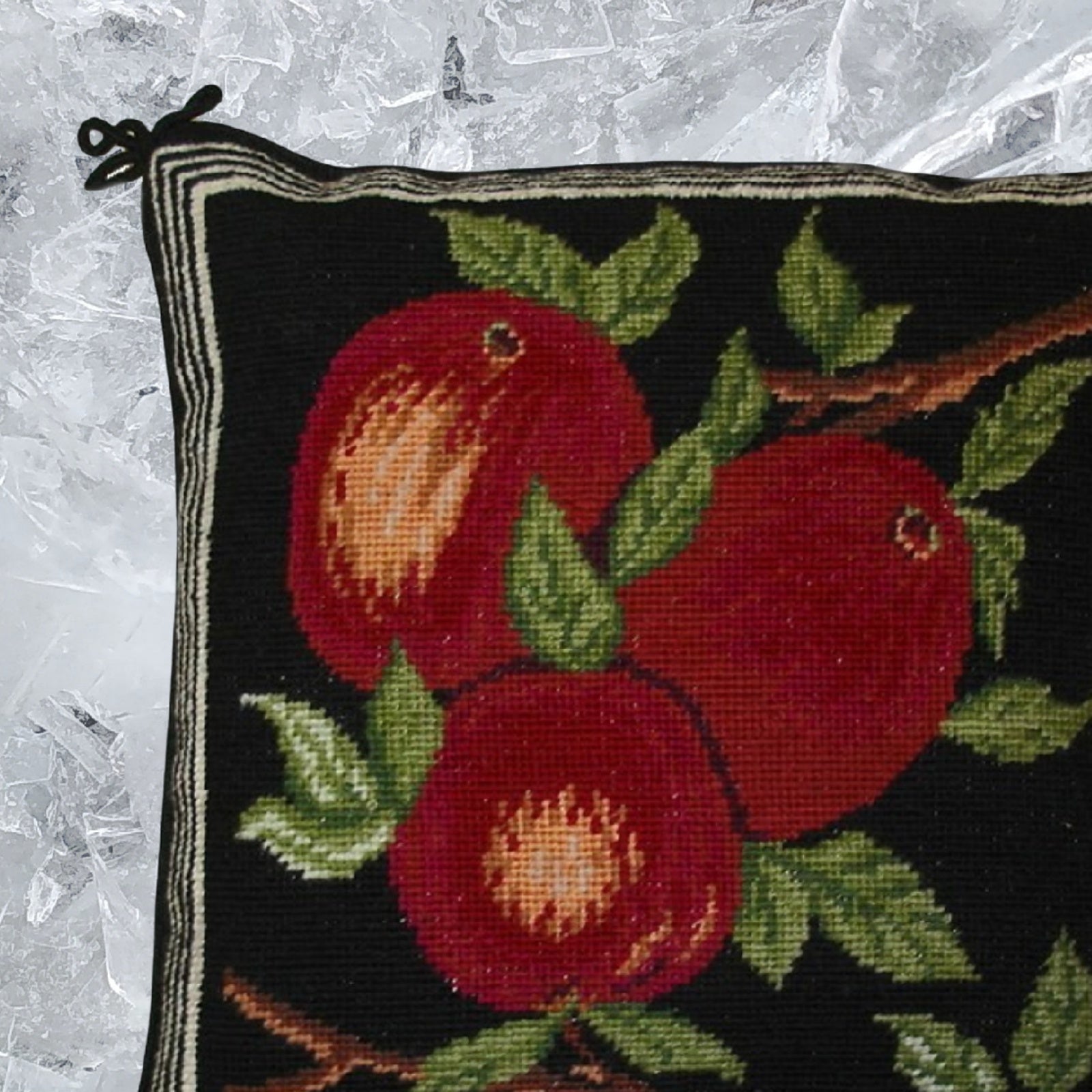 Handmade Wool Needlepoint Pillow Cover - Decorative Throw Cushion Cover - Vintage Floral Embroidery Design red apples black background
