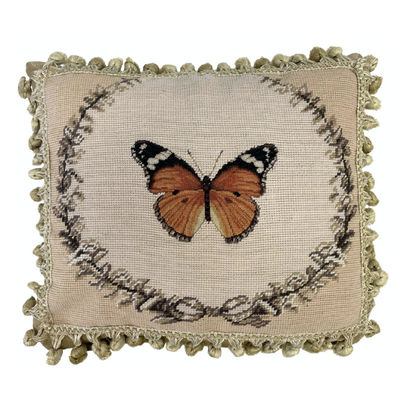 Handmade Wool Needlepoint Pillow Cover - Decorative Throw Cushion Cover - Vintage Floral Embroidery Design orange butterfly with 2 color tassel