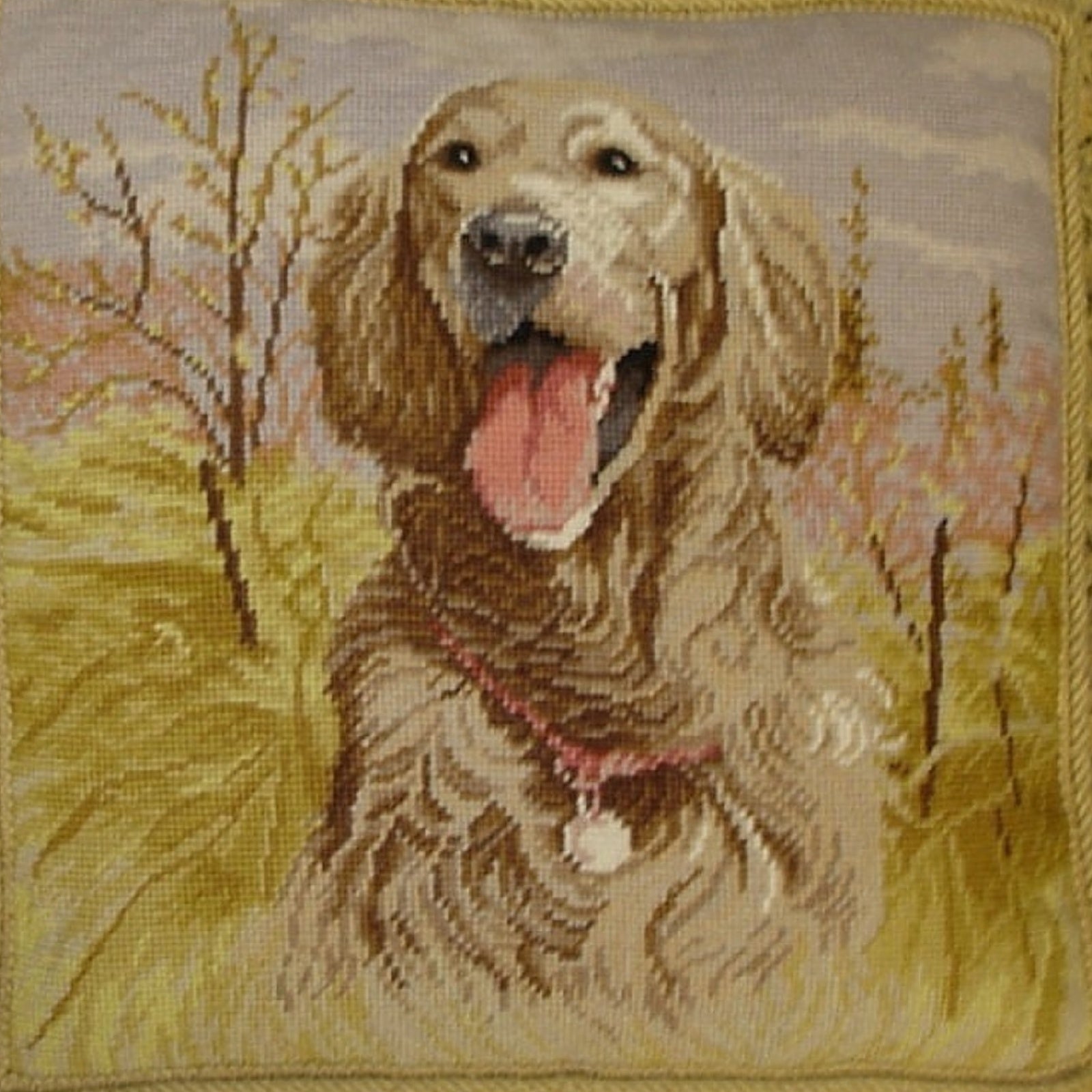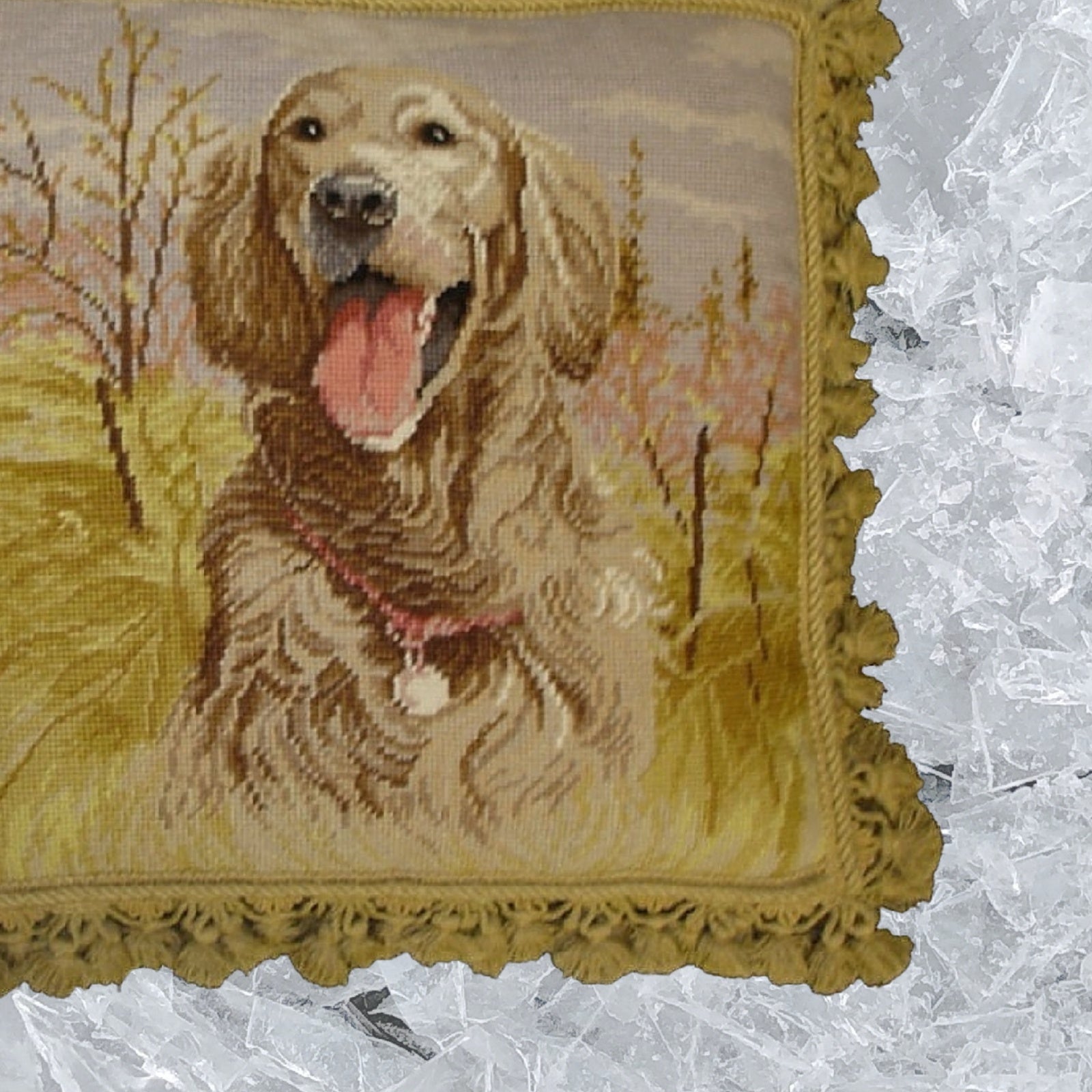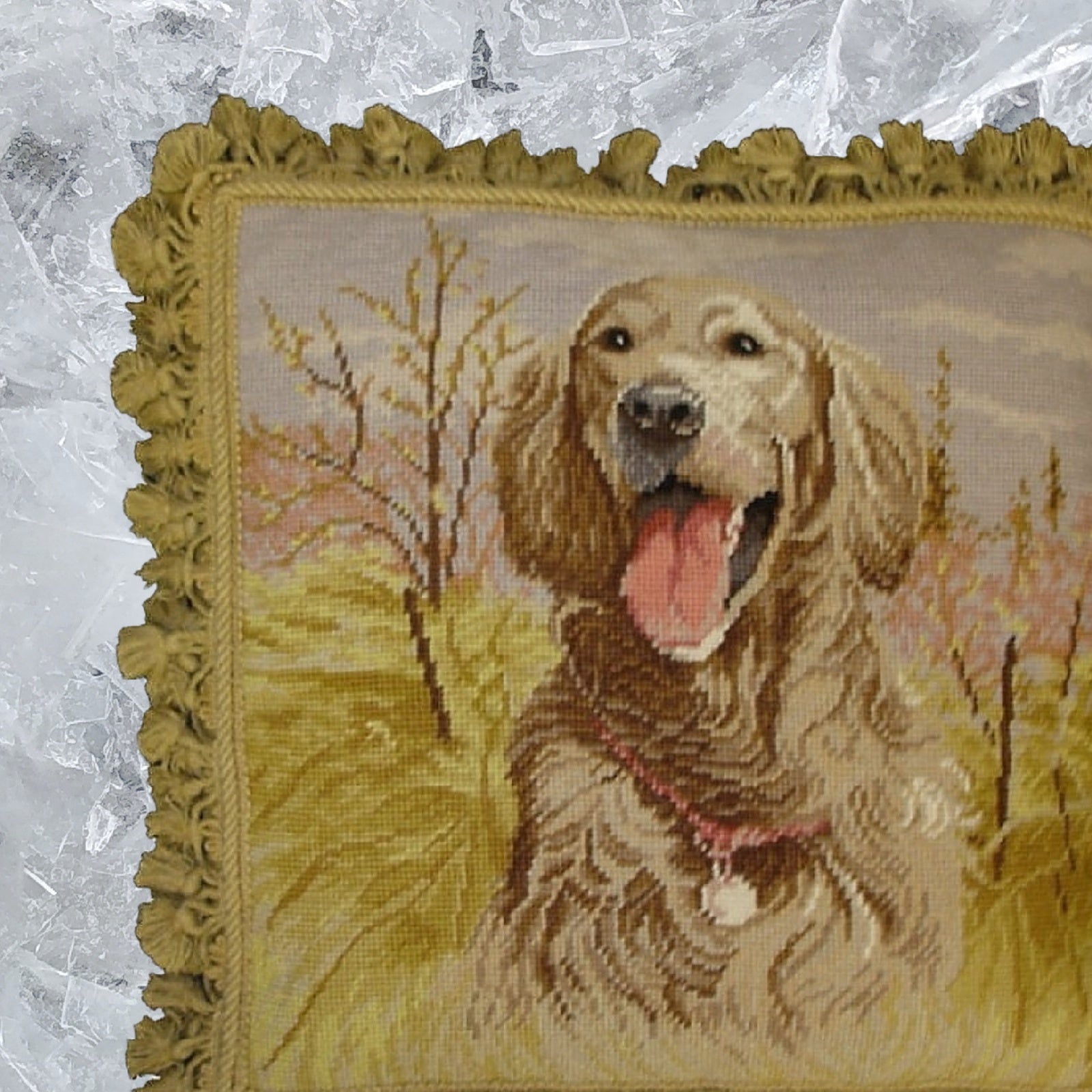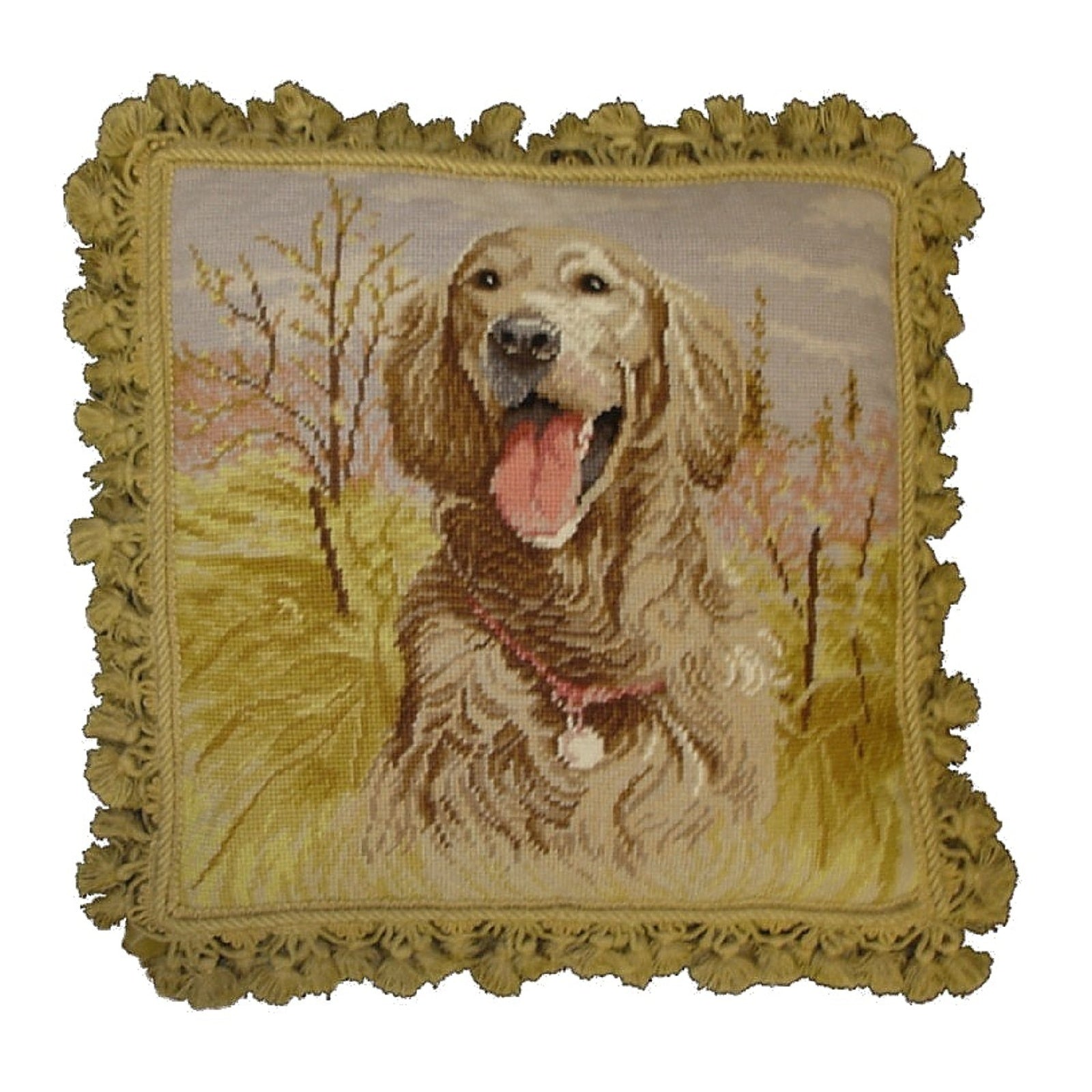Handmade Wool Needlepoint Pillow Cover - Decorative Throw Cushion Cover - Vintage Floral Embroidery Design gold lab with tassel