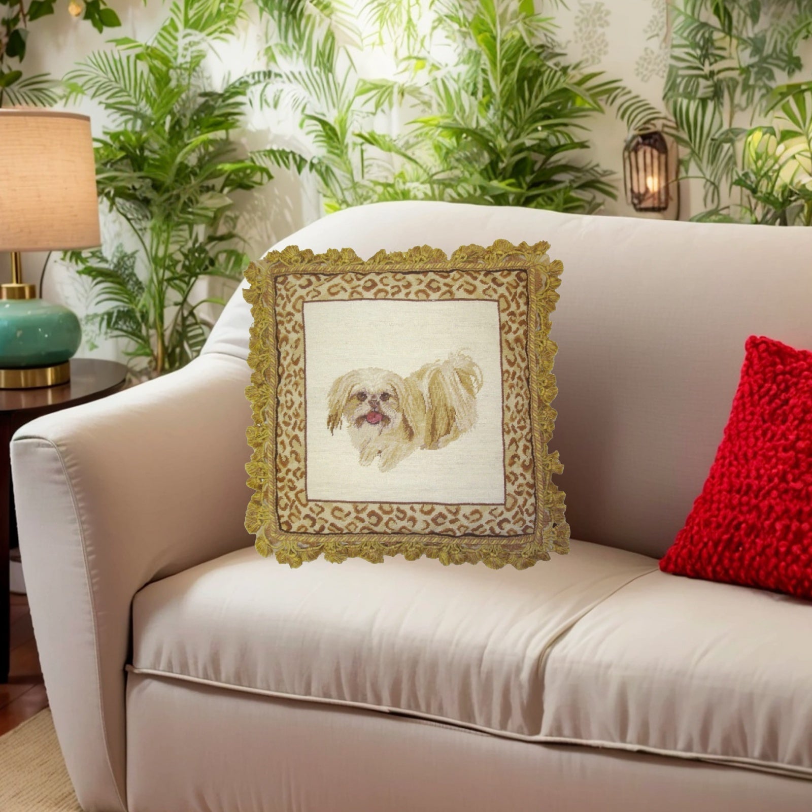 Handmade Wool Needlepoint Pillow Cover - Decorative Throw Cushion Cover - Vintage Floral Embroidery Design playfully Shih-Tzu with animal print frame 2 color tassels