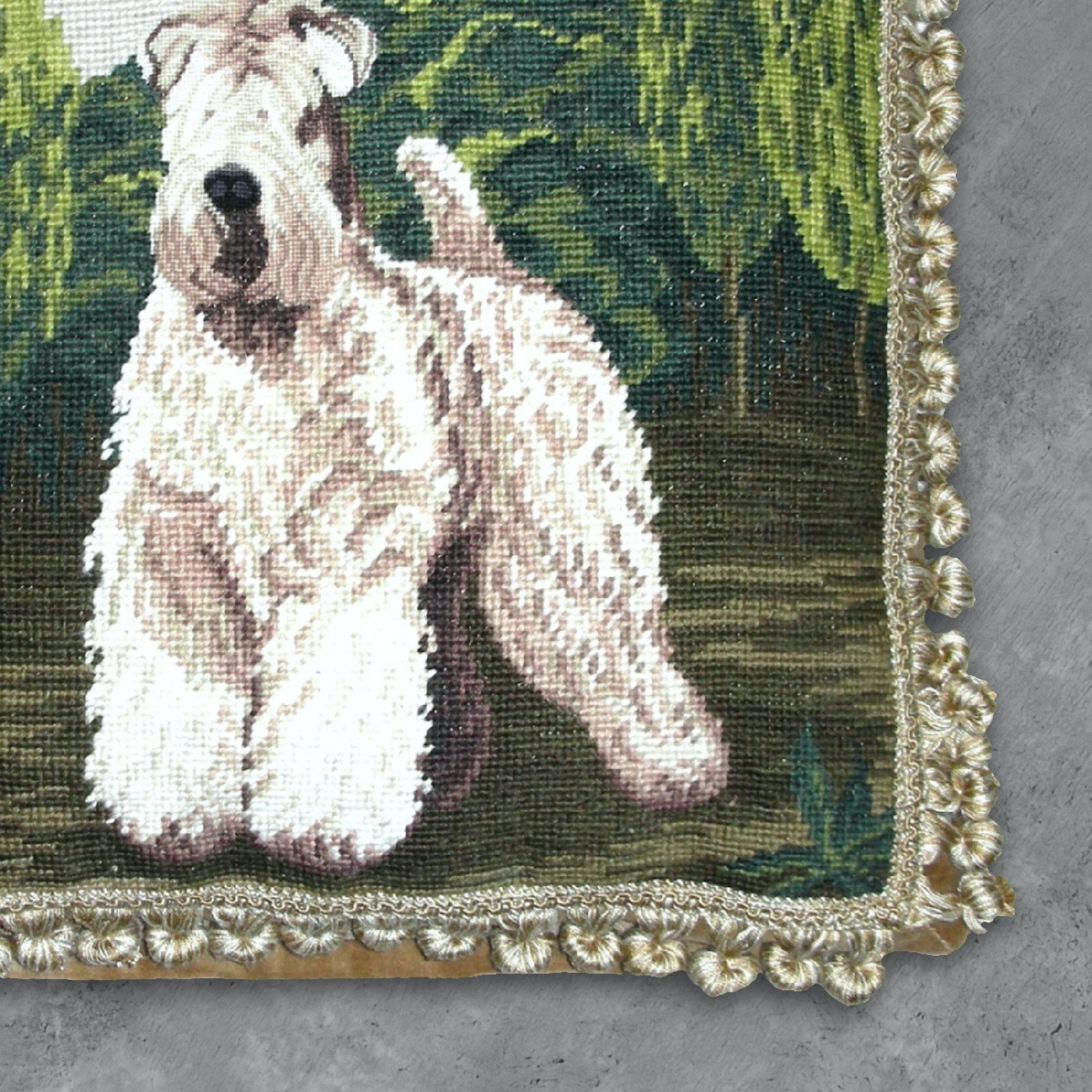 Handmade Wool Needlepoint Pillow Cover - Decorative Throw Cushion Cover - Vintage Floral Embroidery Design white Wheaten Terrie face rest with tassels