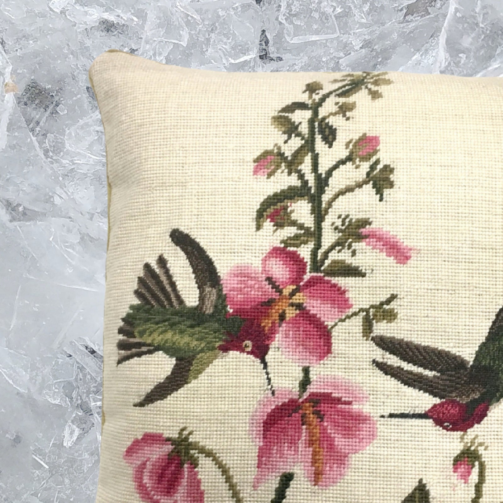 Handmade Wool Needlepoint Pillow Cover - Decorative Throw Cushion Cover - Vintage Floral Embroidery Design 2 humming birds pink flowers