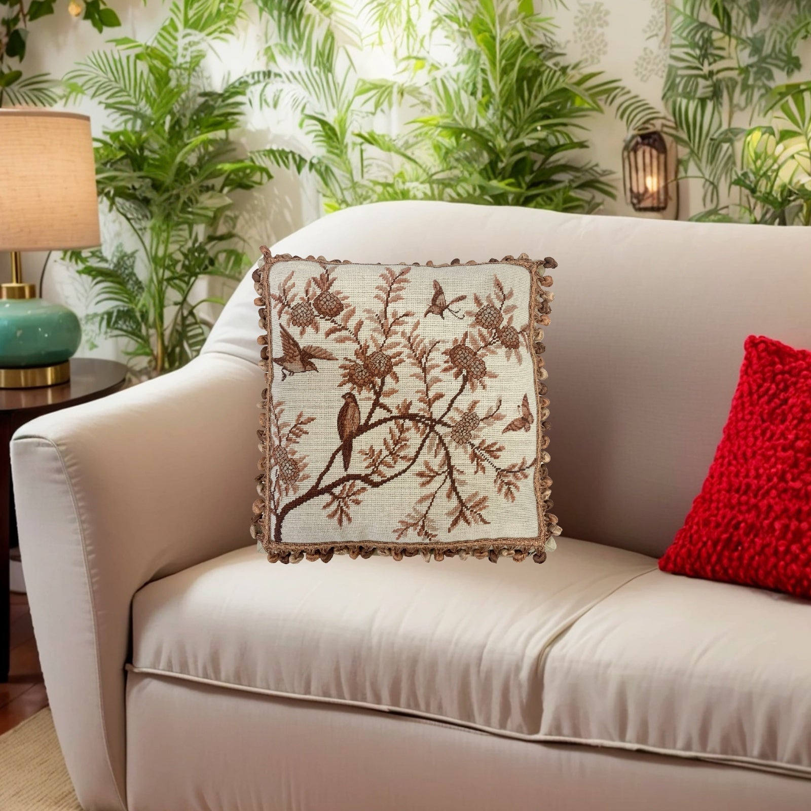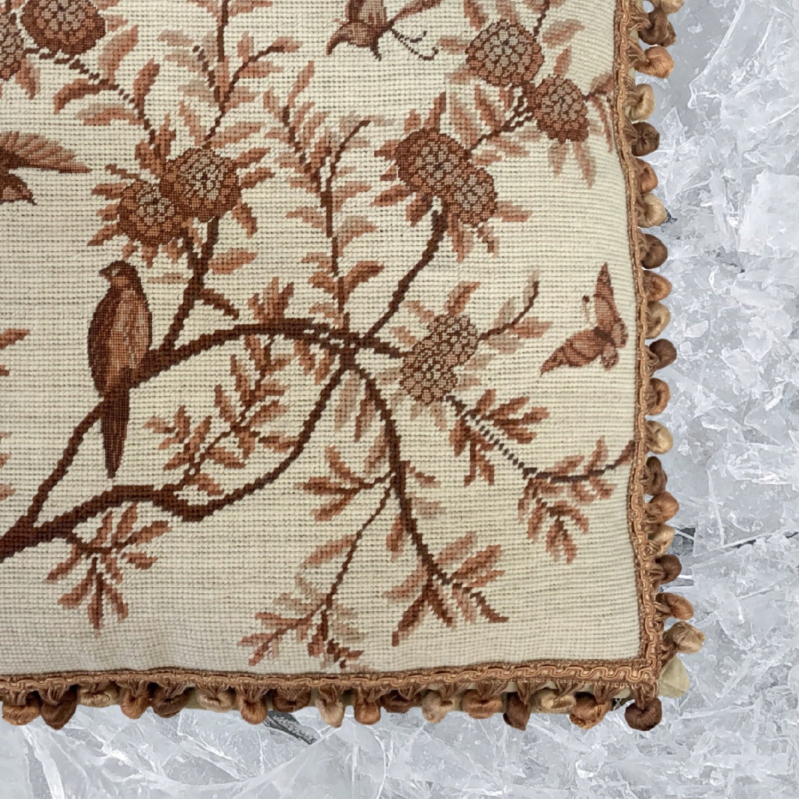 Handmade Wool Needlepoint Pillow Cover - Decorative Throw Cushion Cover - Vintage Floral Embroidery Design antique tree swallows butterfliers with tassels 1