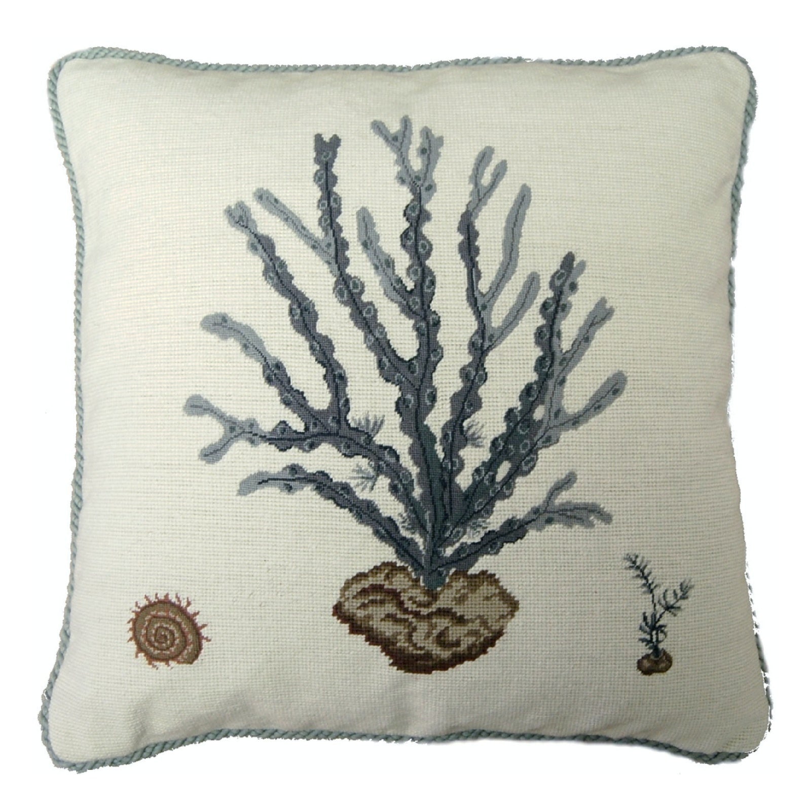 Handmade Wool Needlepoint Pillow Cover - Decorative Throw Cushion Cover - Vintage Floral Embroidery Design blue water weed in blue with blue cording