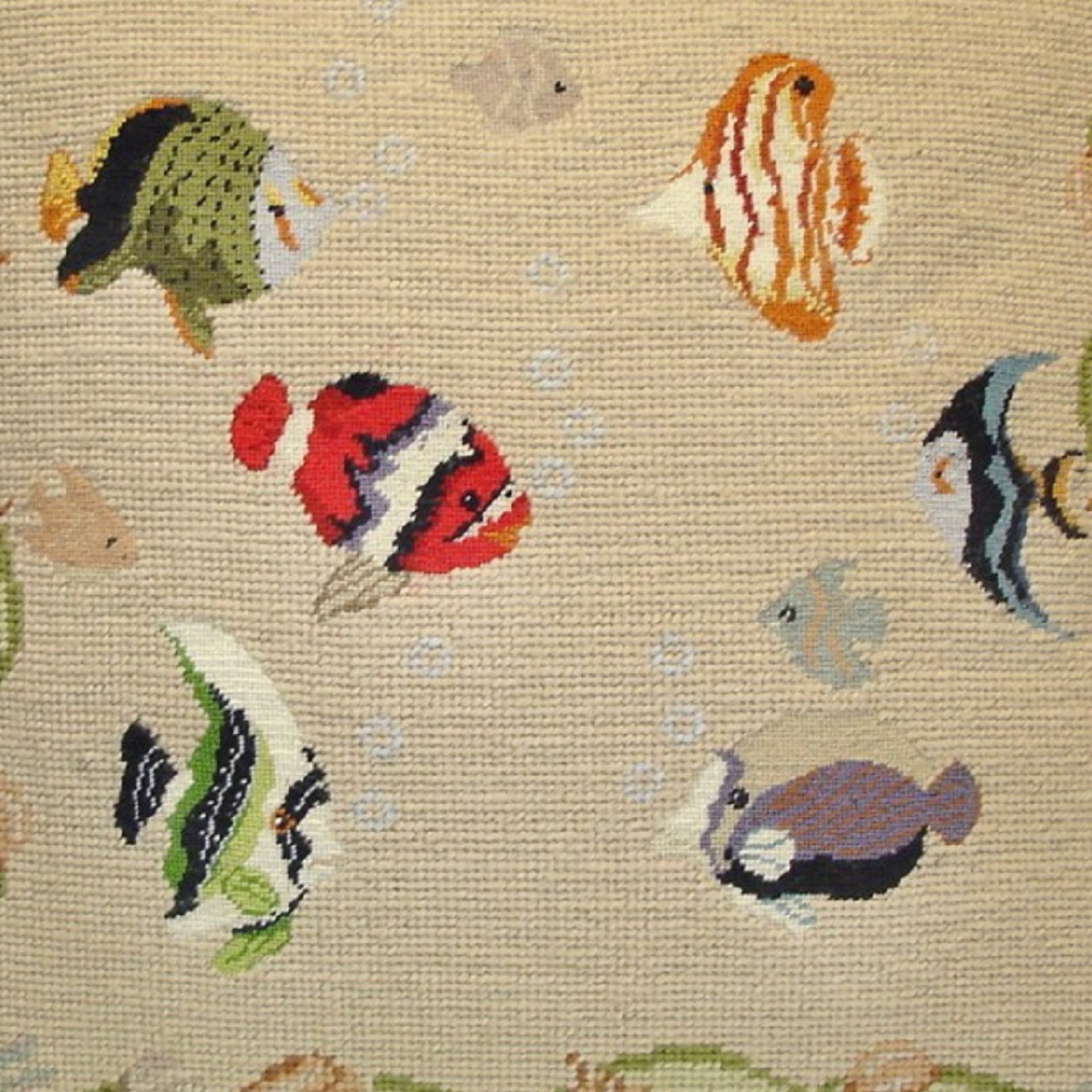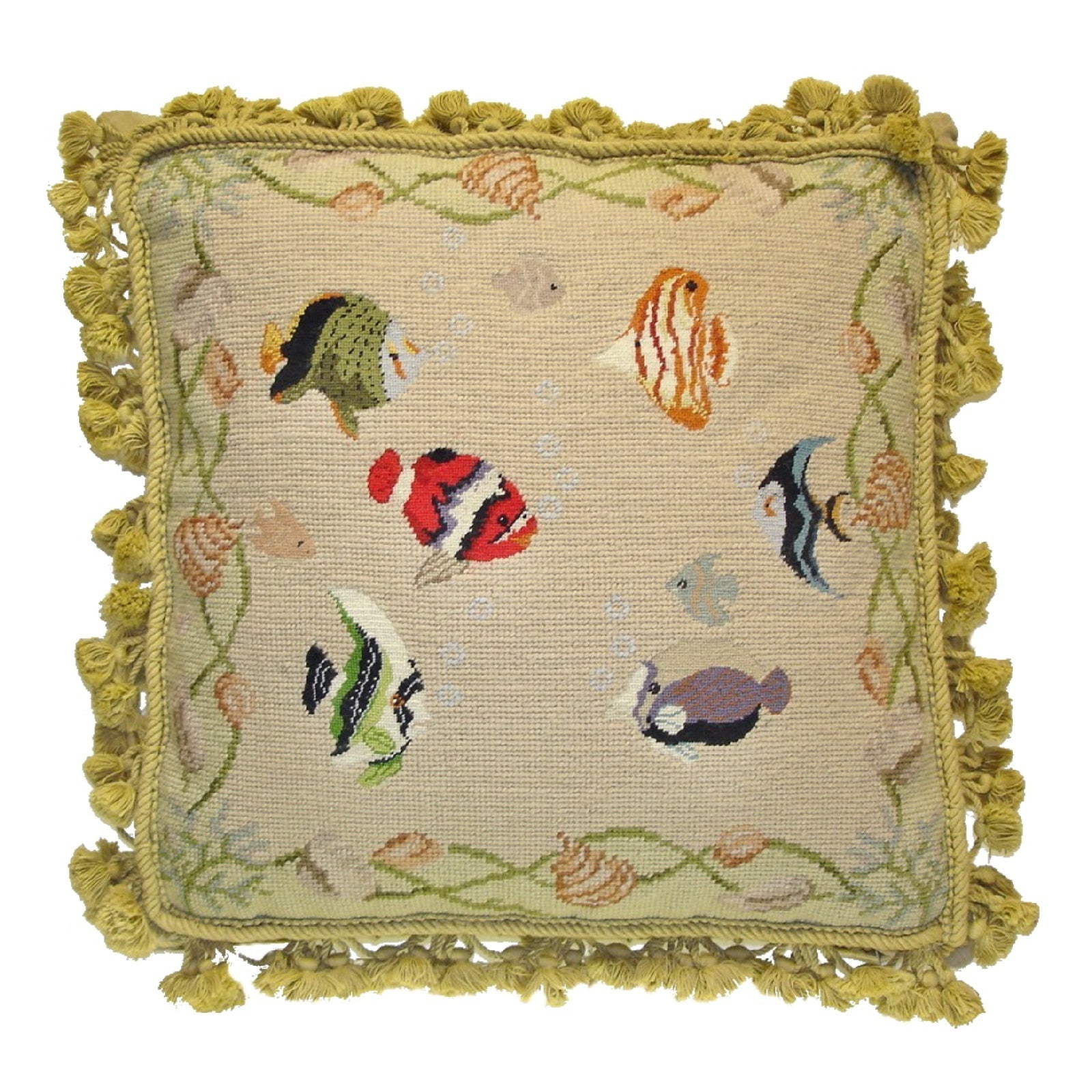 Handmade Wool Needlepoint Pillow Cover - Decorative Throw Cushion Cover - Vintage Floral Embroidery Design fishes with grosspoint 2 color background, nature tassels