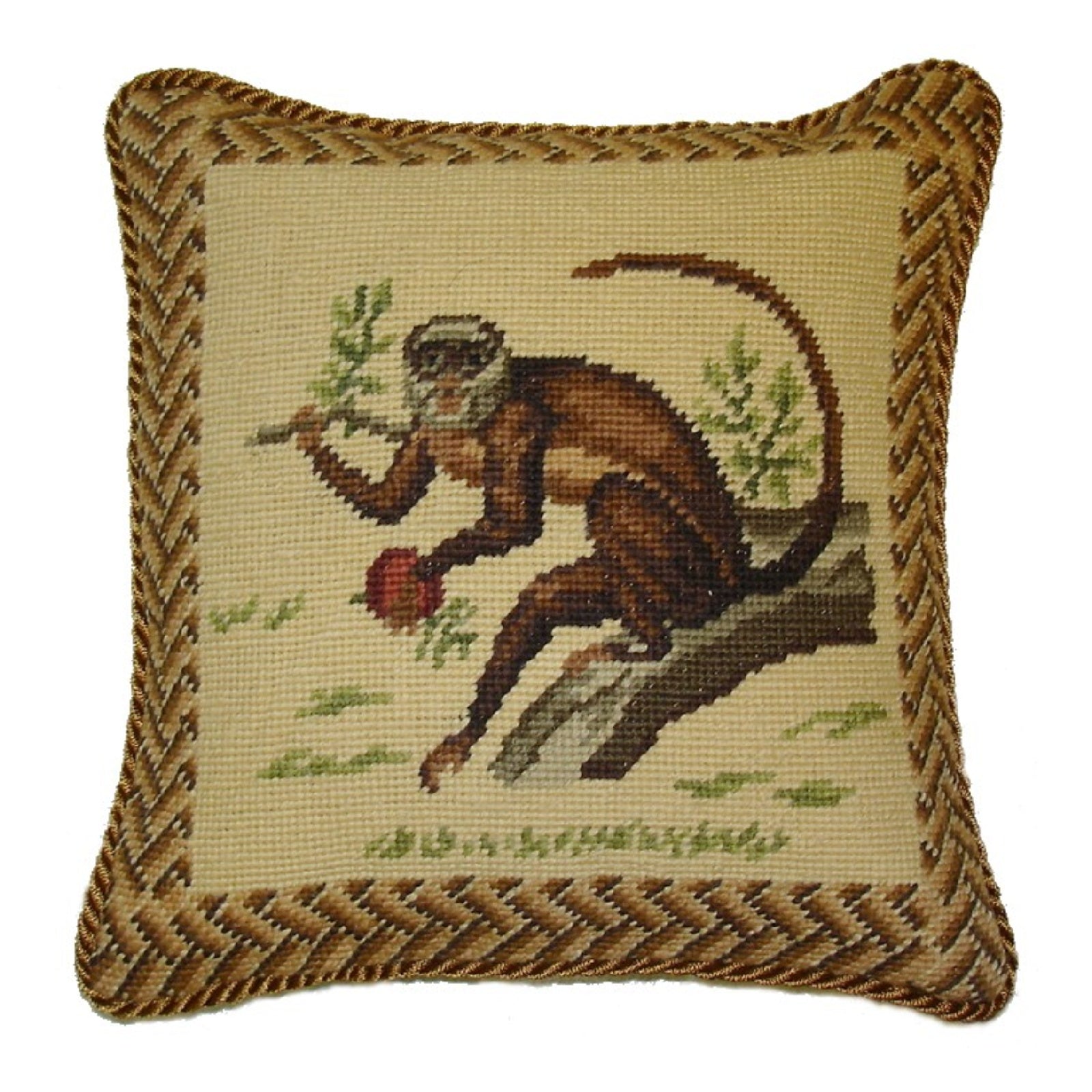 Handmade Wool Needlepoint Pillow Cover - Decorative Throw Cushion Cover - Vintage Floral Embroidery Design monkey carry leaves with cording