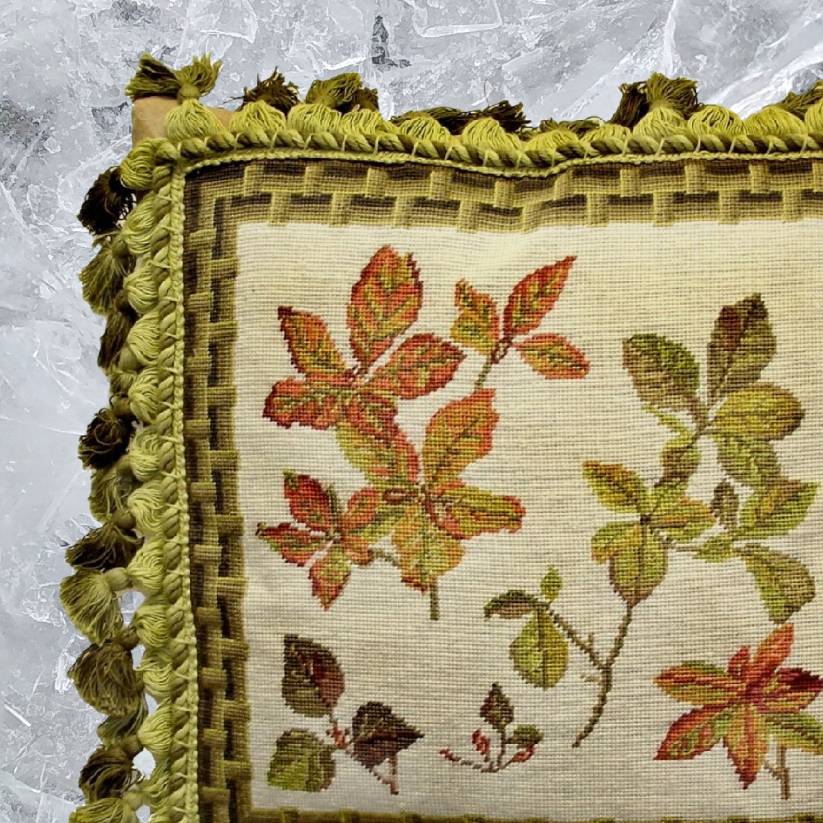 Handmade Wool Needlepoint Pillow Cover - Decorative Throw Cushion Cover - Vintage Floral Embroidery Design leaves bamboo frame with 3 color tassel