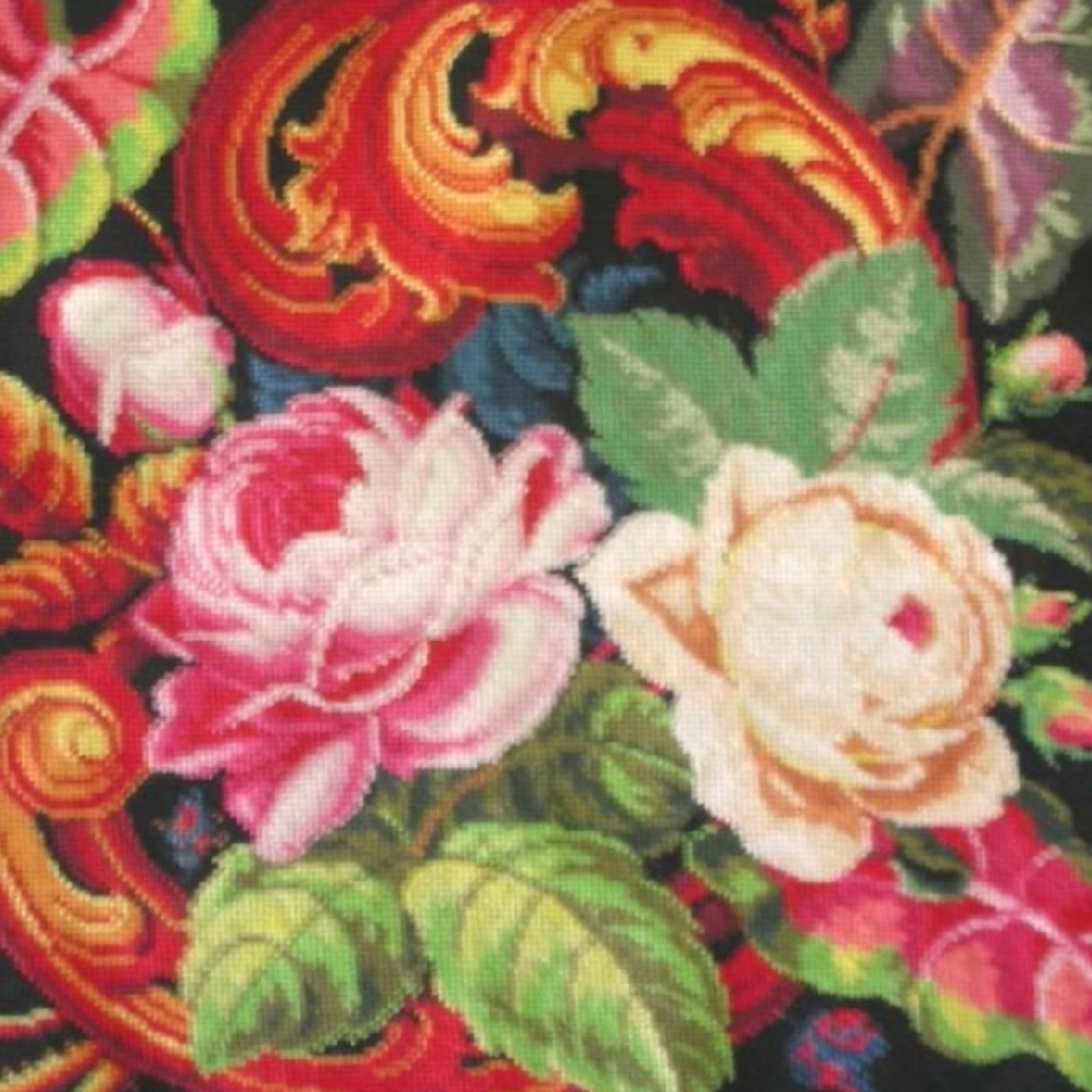 Handmade Wool Needlepoint Pillow Cover - Decorative Throw Cushion Cover - Vintage Floral Embroidery Design floral black background