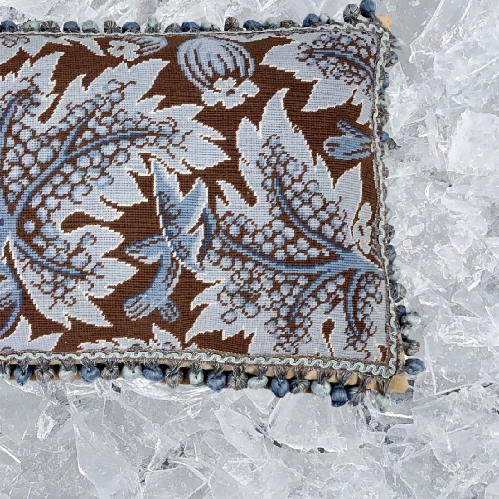 Handmade Wool Needlepoint Pillow Cover - Decorative Throw Cushion Cover - Vintage Floral Embroidery Design blue grape leaves brown background with tassels