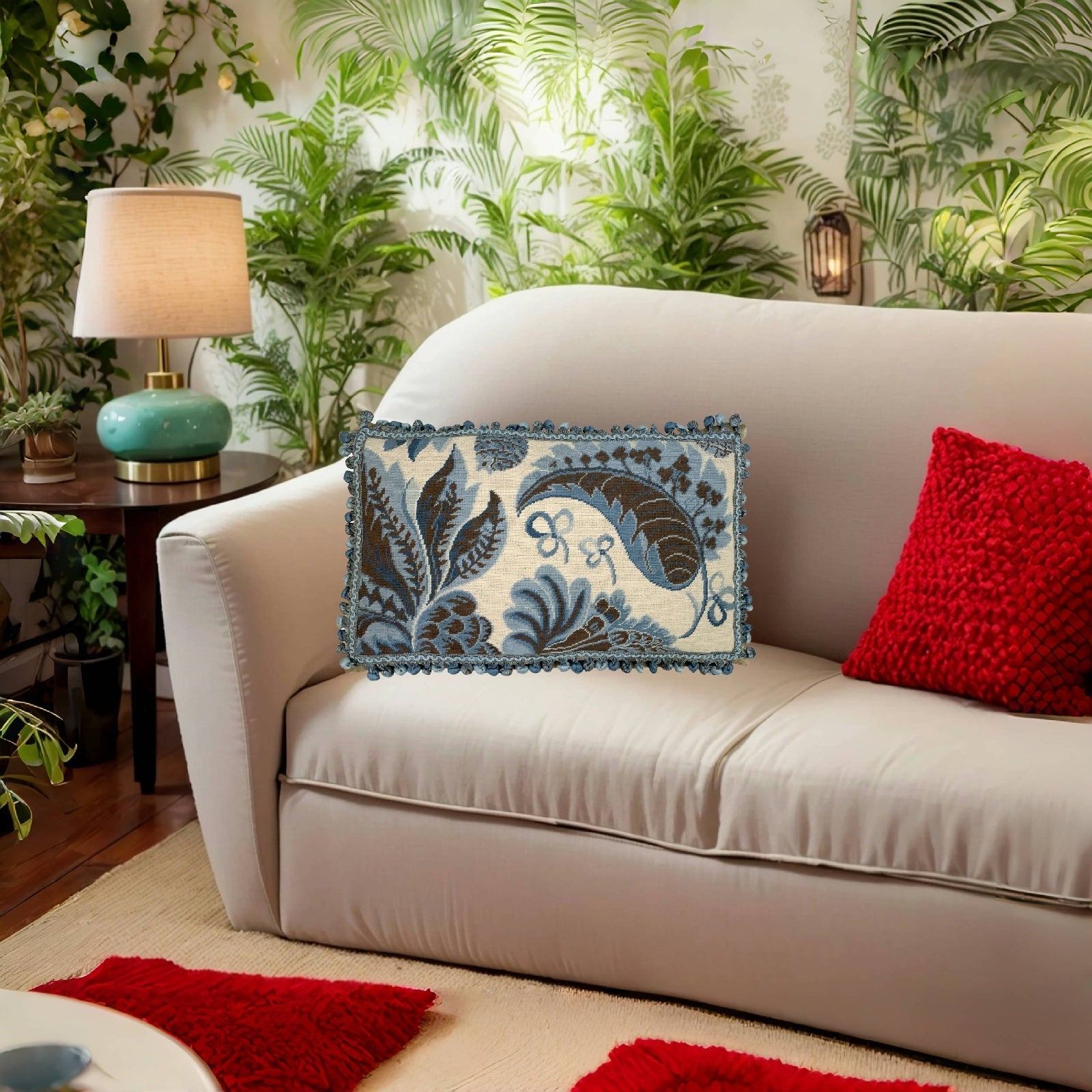 Handmade Wool Needlepoint Pillow Cover - Decorative Throw Cushion Cover - Vintage Floral Embroidery Designblue tropical leaves ivory background with tassels I