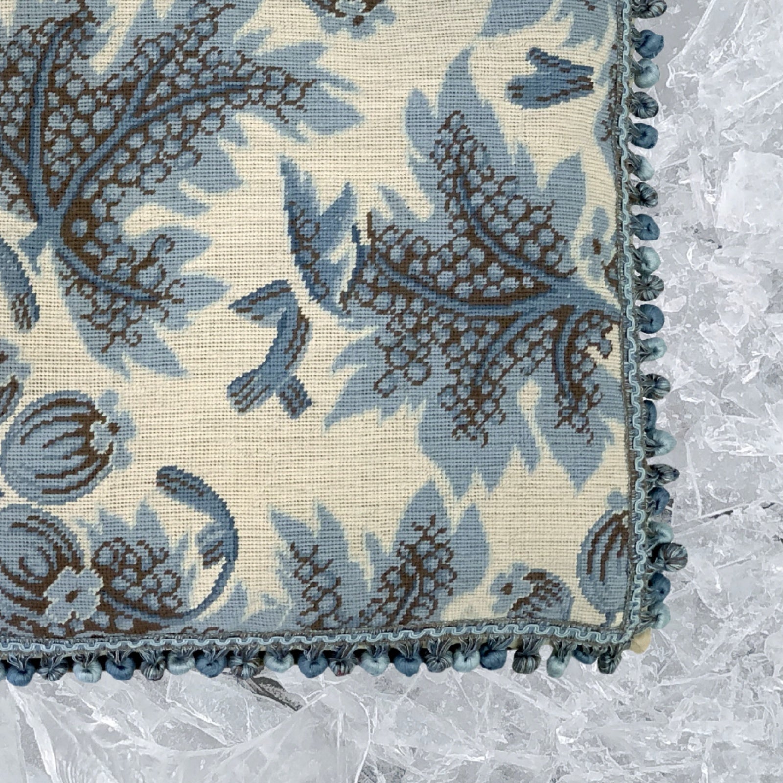 Handmade Wool Needlepoint Pillow Cover - Decorative Throw Cushion Cover - Vintage Floral Embroidery Design blue grapes leaves ivory background with tassels