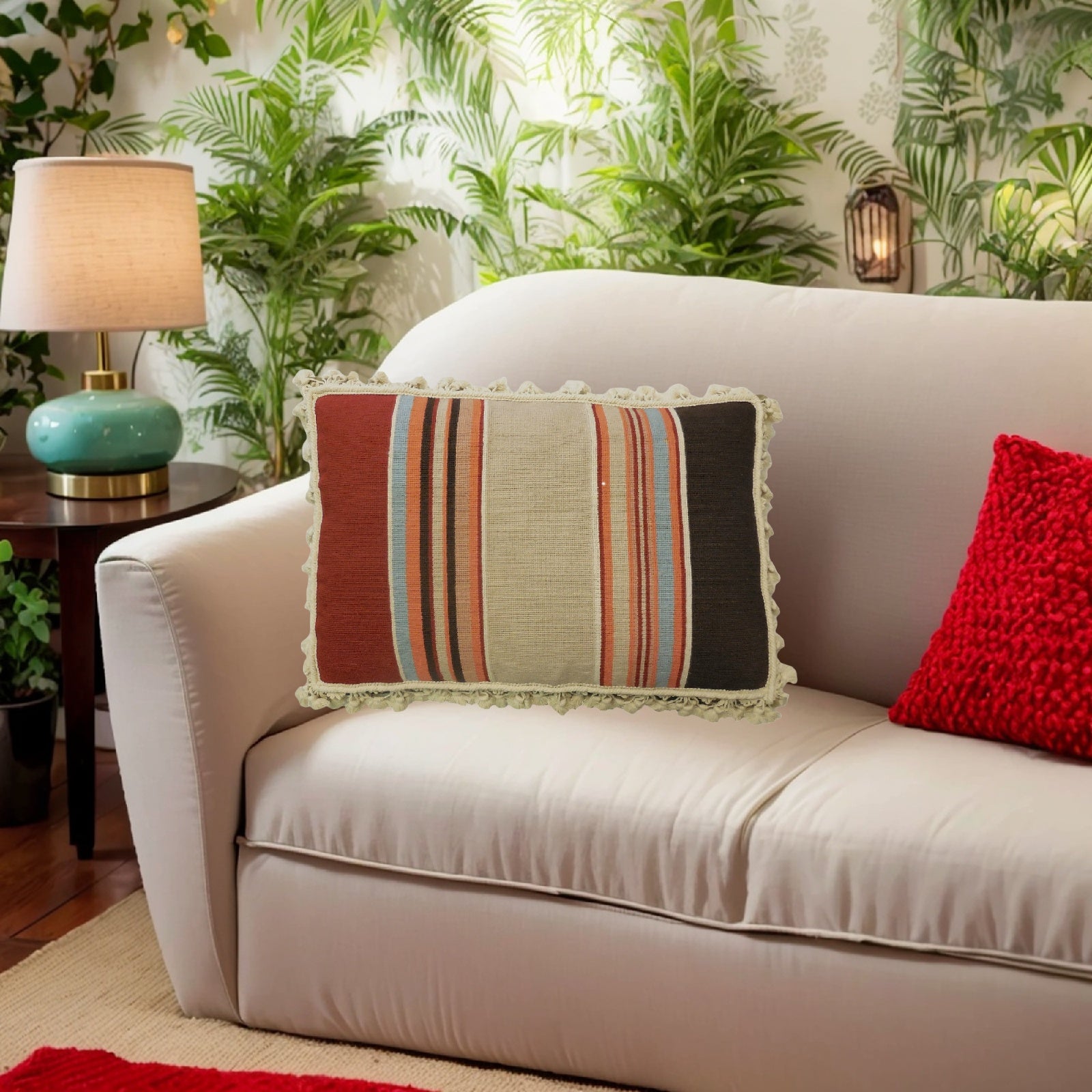 Handmade Wool Needlepoint Pillow Cover - Decorative Throw Cushion Cover - Vintage Floral Embroidery Design strips in red, blue, brown, sand, orange with tassels