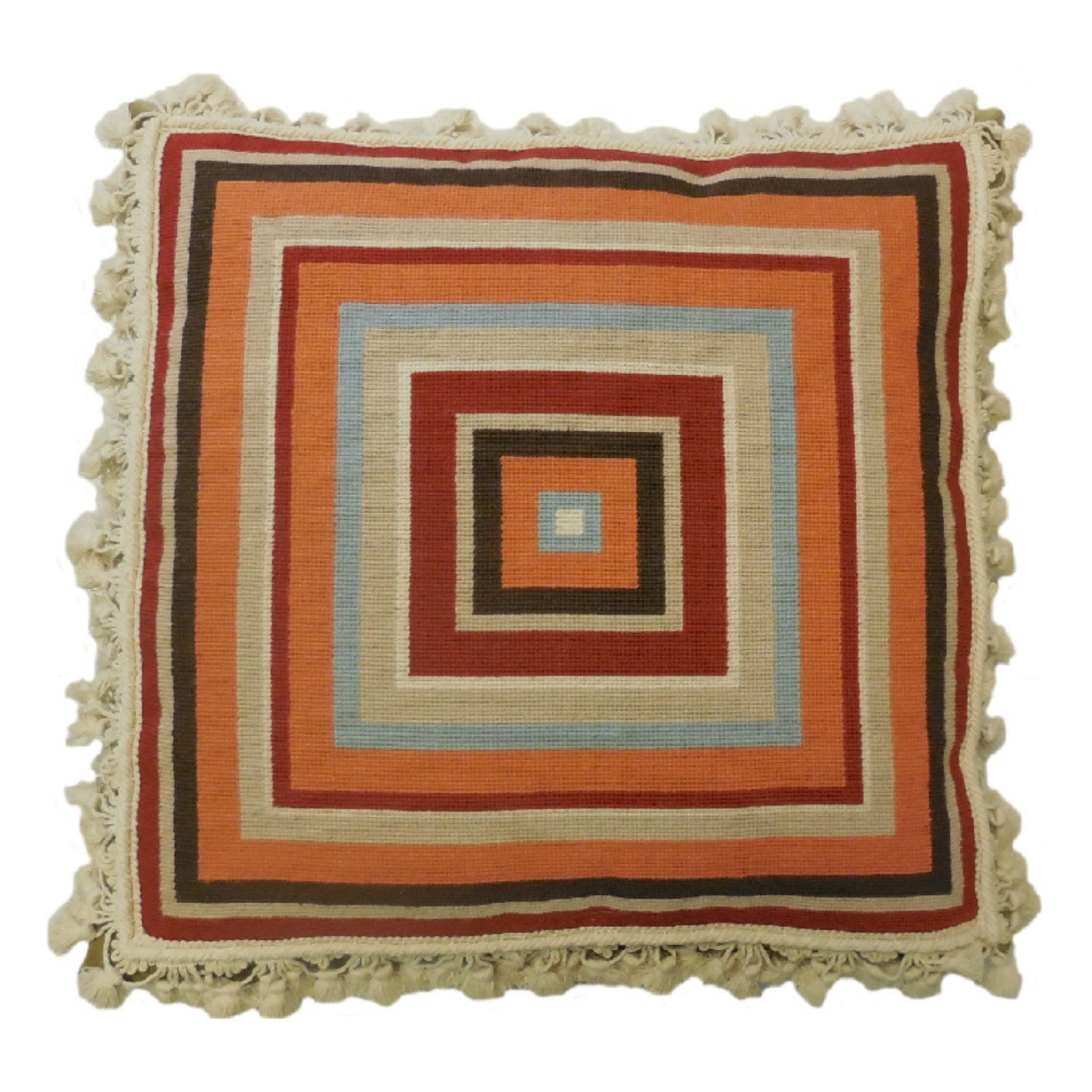 Handmade Wool Needlepoint Pillow Cover - Decorative Throw Cushion Cover - Vintage Floral Embroidery Design square in red, brown, blue, sand, salmon with tassels