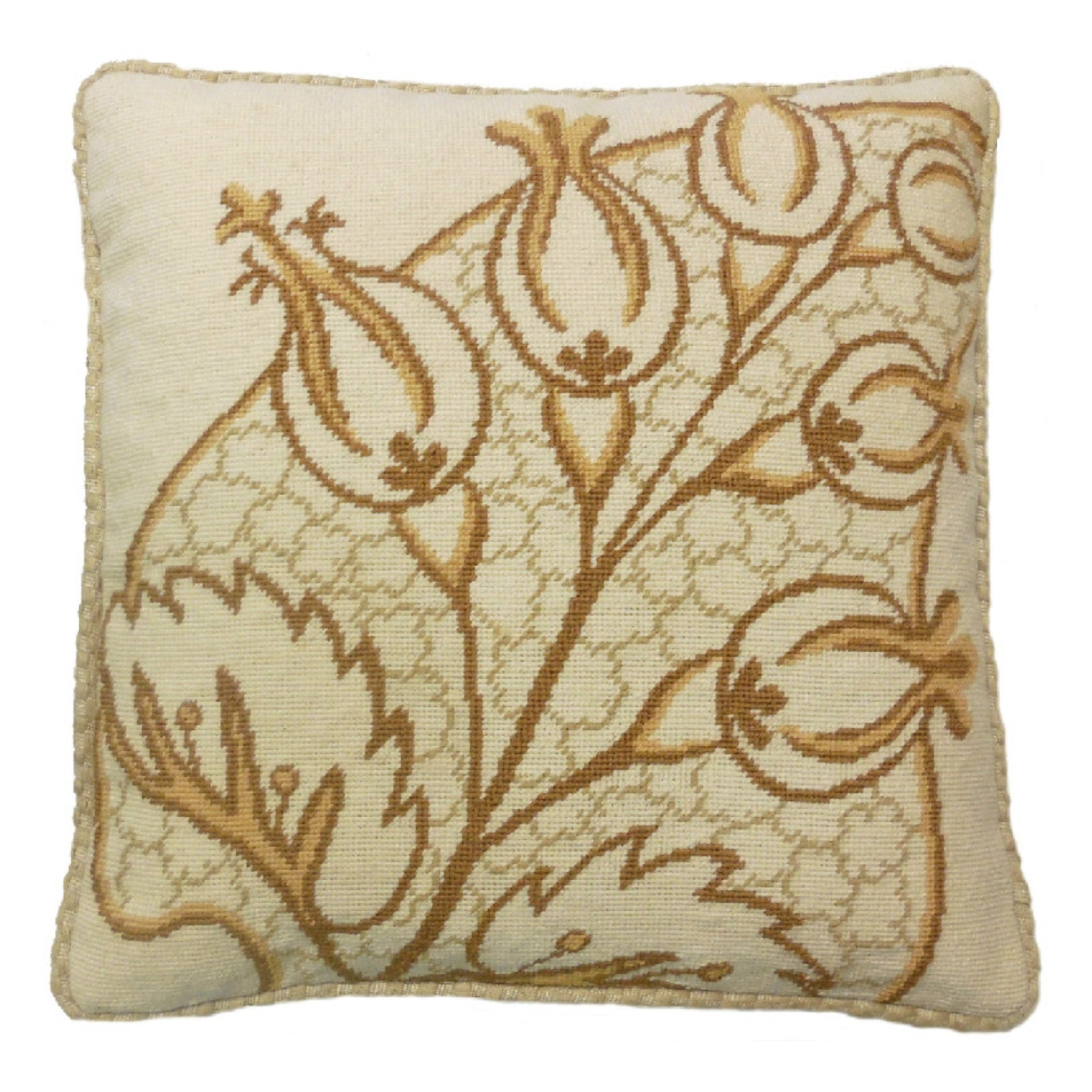 Handmade Wool Needlepoint Pillow Cover - Decorative Throw Cushion Cover - Vintage Floral Embroidery Design brown/yellow big leaves/Flowers checker cording