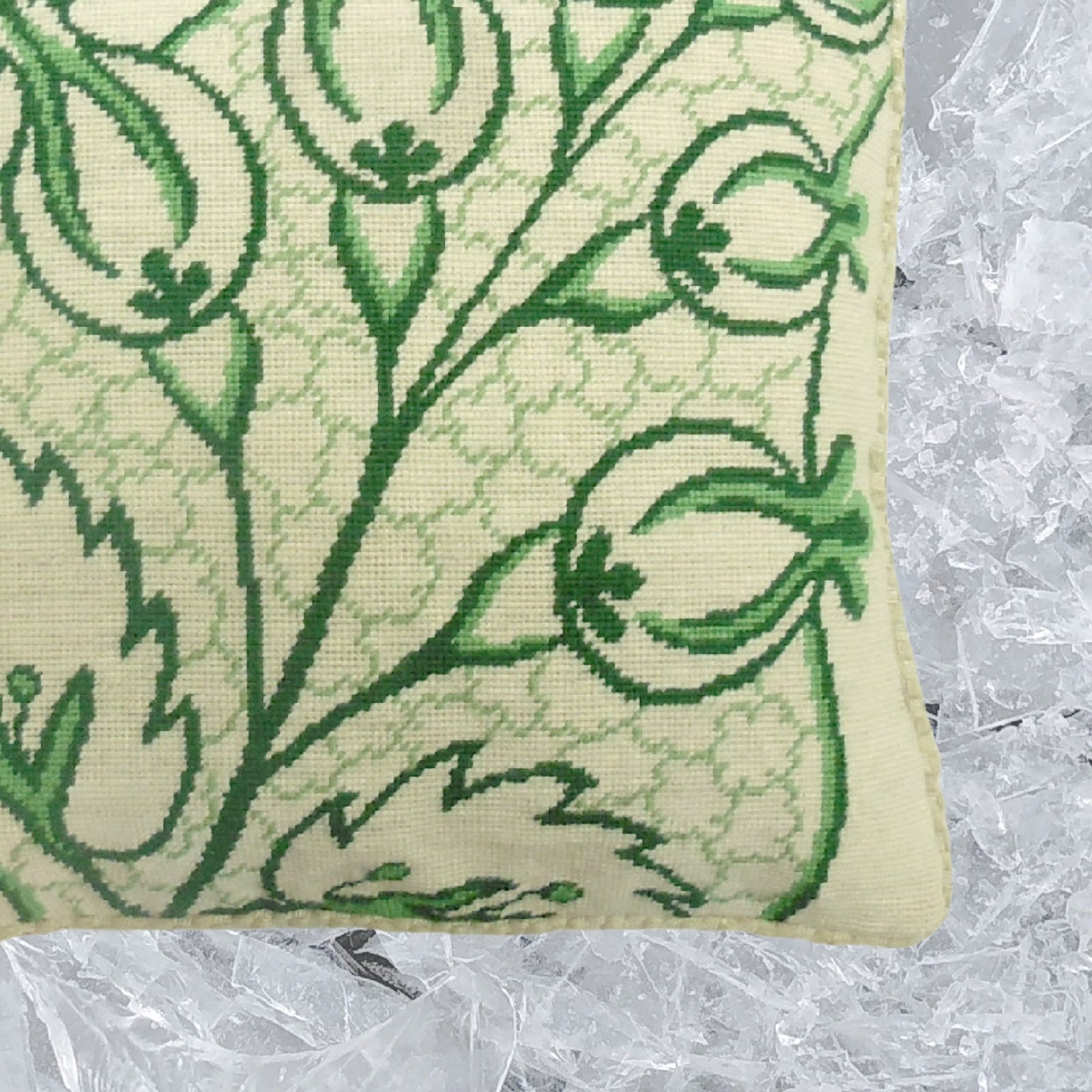 Handmade Wool Needlepoint Pillow Cover - Decorative Throw Cushion Cover - Vintage Floral Embroidery Design green big leaves/flowers checker cording