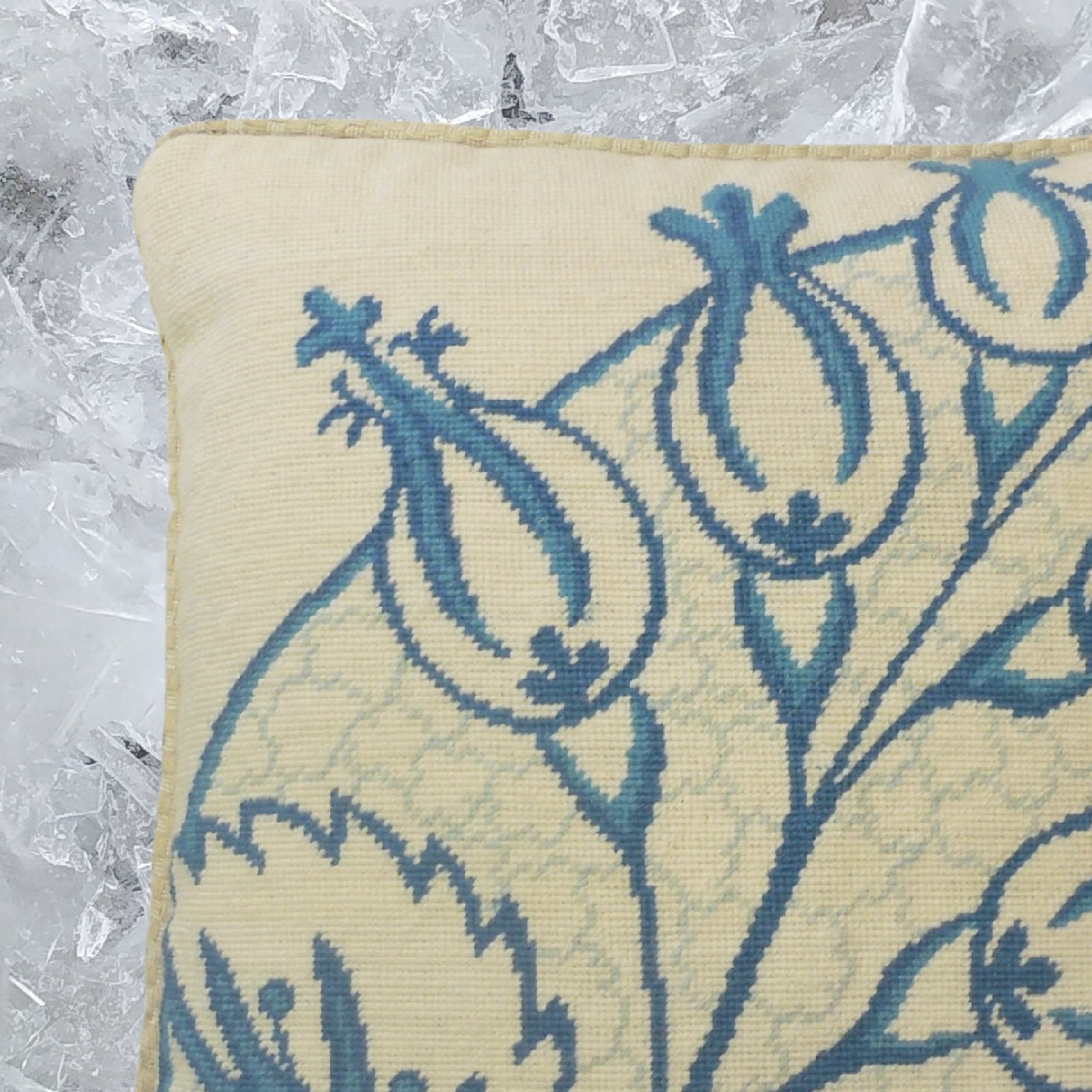 Handmade Wool Needlepoint Pillow Cover - Decorative Throw Cushion Cover - Vintage Floral Embroidery Design blue big leaves/flowers checker cording