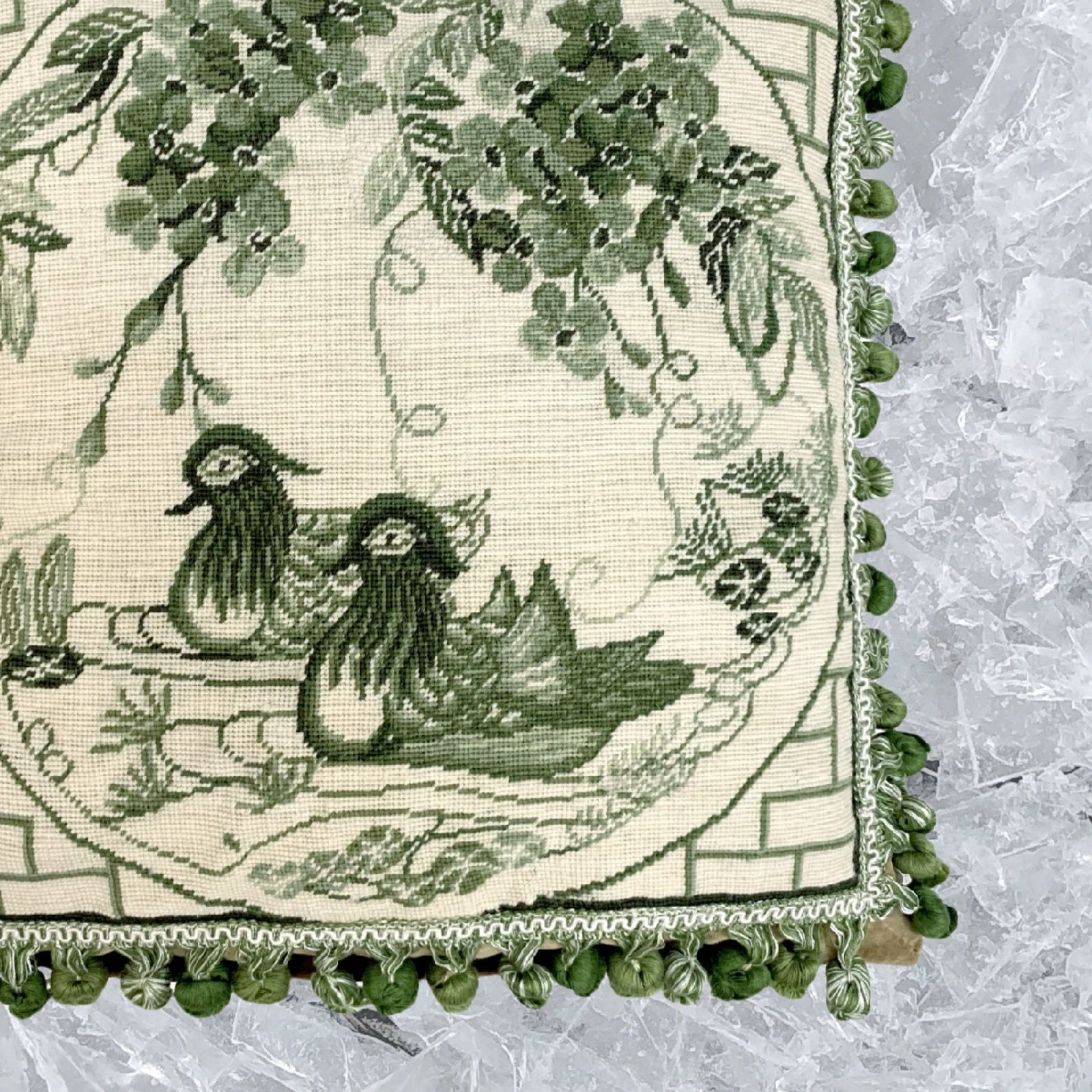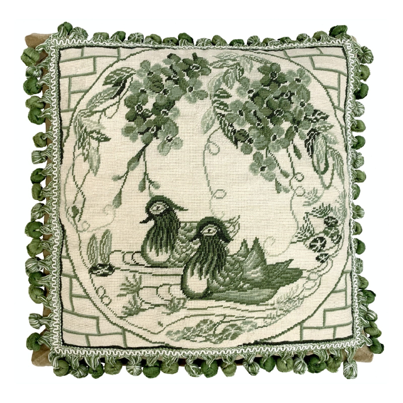 Handmade Wool Needlepoint Pillow Cover - Decorative Throw Cushion Cover - Vintage Floral Embroidery Design green Manderain Ducks plum flower with tassels