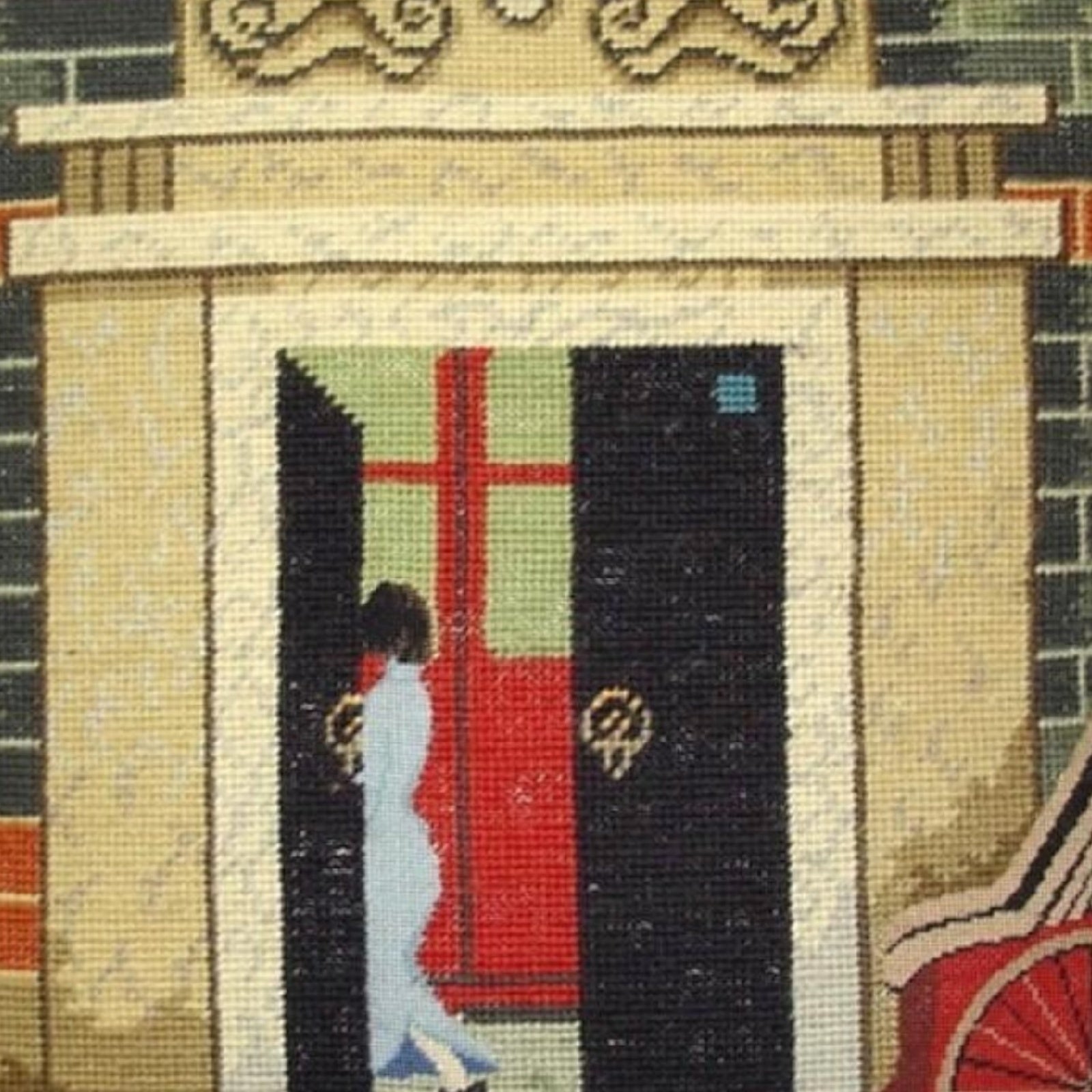 100% Wool Hand-Embroidered Christmas Stocking, 12 x 6 in – Small Handmade Needlepoint Holiday Decoration with Classic Festive Scene