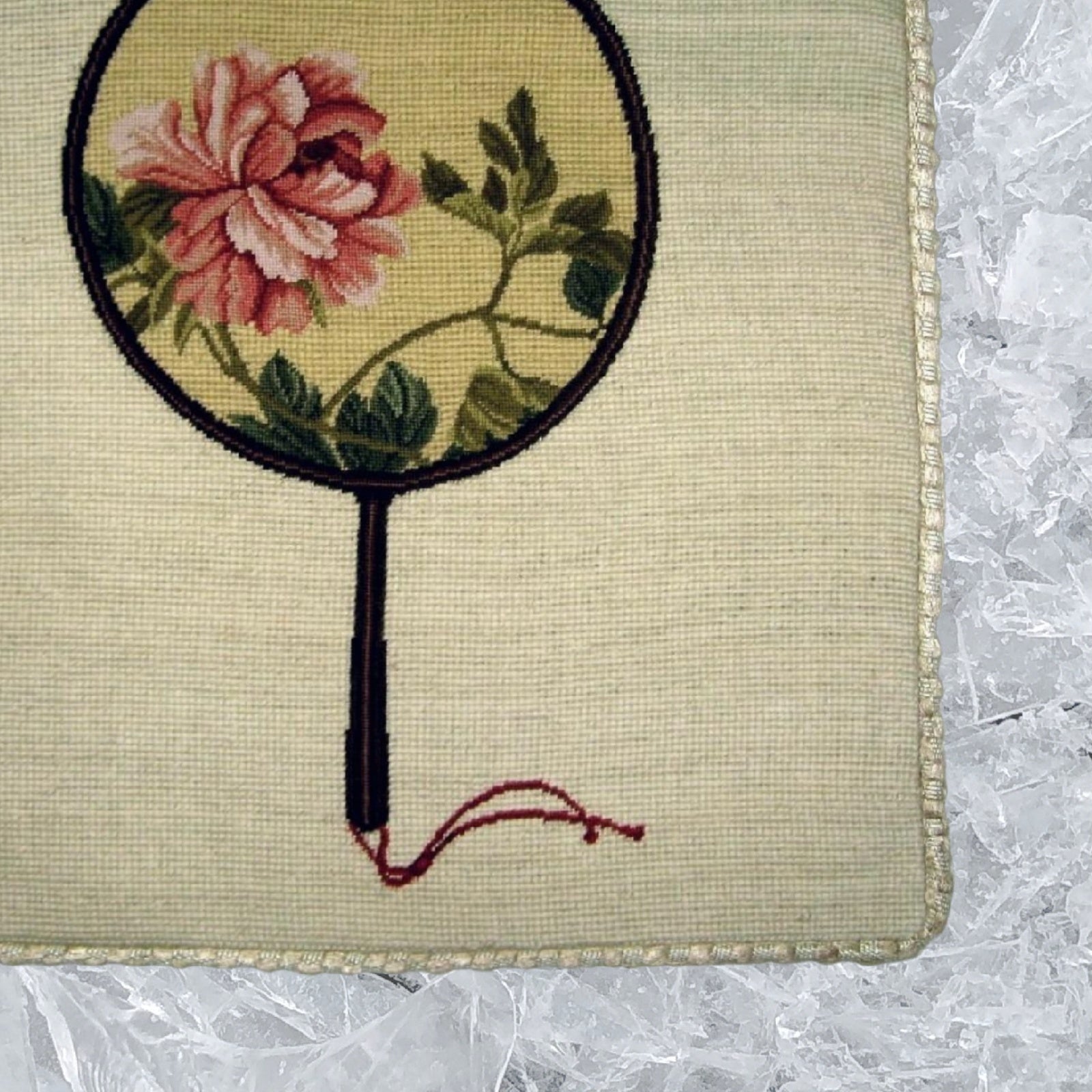 Handmade Wool Needlepoint Pillow Cover - Decorative Throw Cushion Cover - Vintage Floral Embroidery Design pink peony in the Chinese fan with checker border