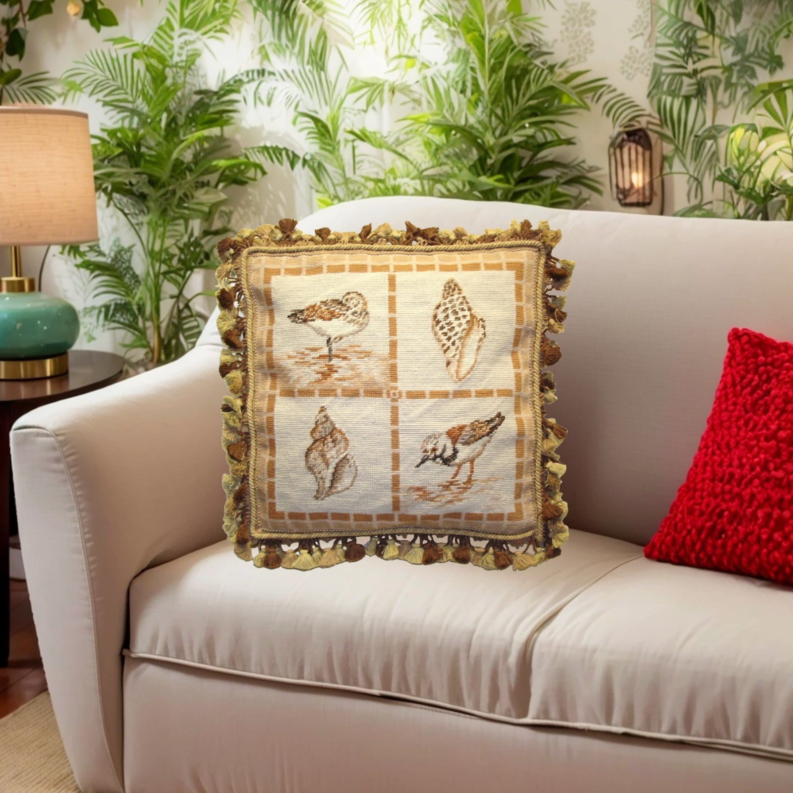 Handmade Wool Needlepoint Pillow Cover - Decorative Throw Cushion Cover - Vintage Floral Embroidery Design stone shells and birds with tassel