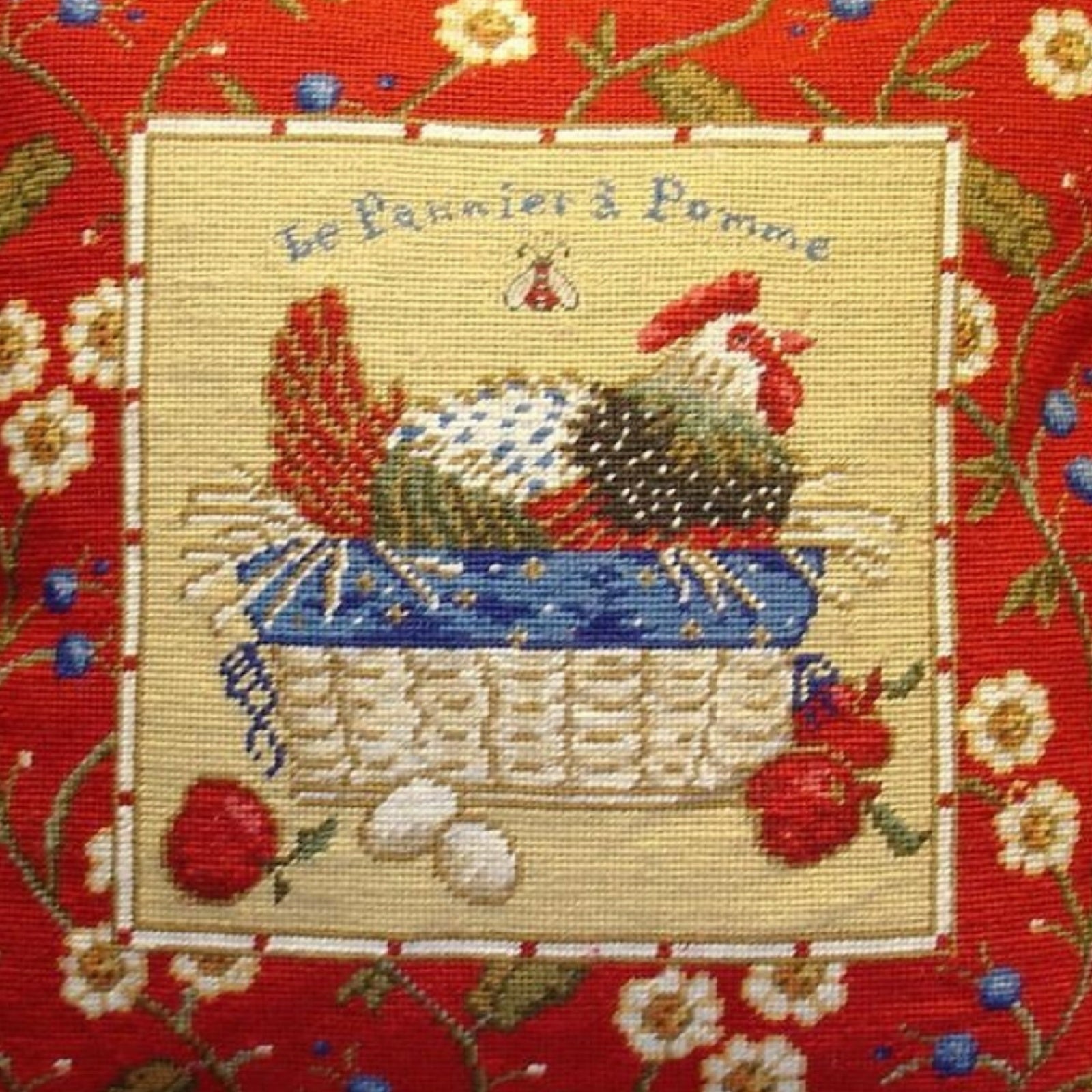 Handmade Wool Needlepoint Pillow Cover - Decorative Throw Cushion Cover - Vintage Floral Embroidery Design SudiMcCollums design Le Panier a Pomme, with bea and 3 color tassel