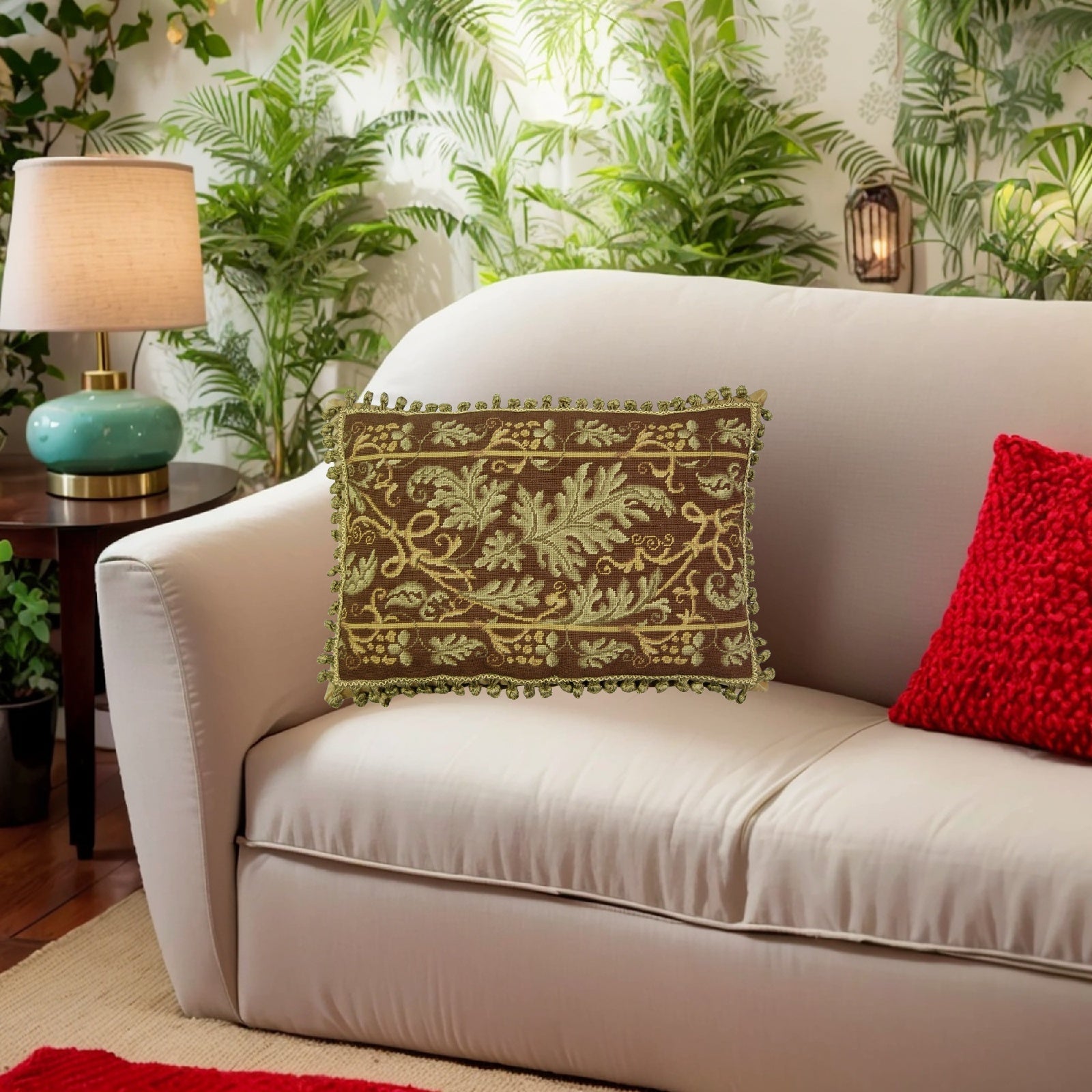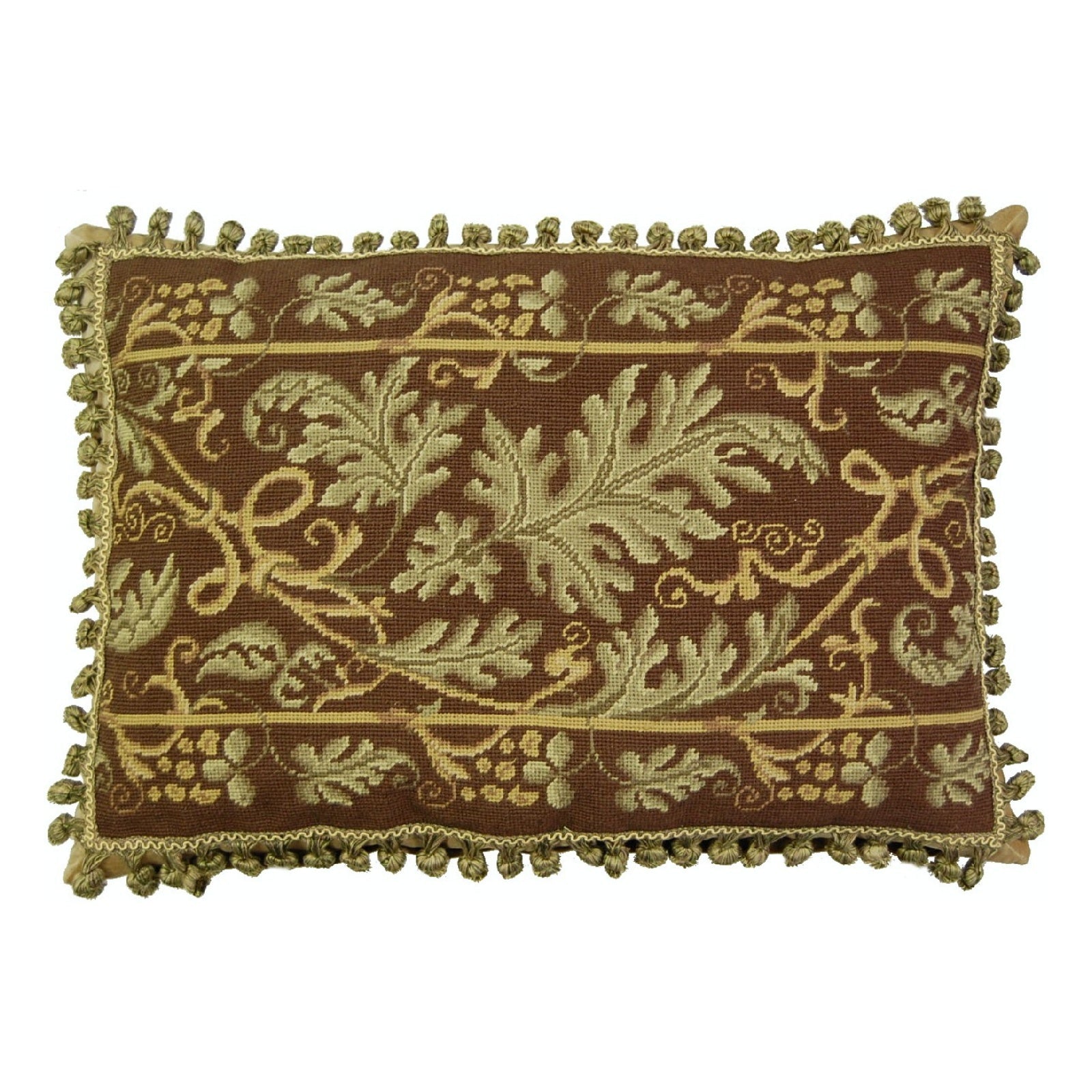 Handmade Wool Needlepoint Pillow Cover - Decorative Throw Cushion Cover - Vintage Floral Embroidery Design olive-brown grape leaves with 2 color tassel