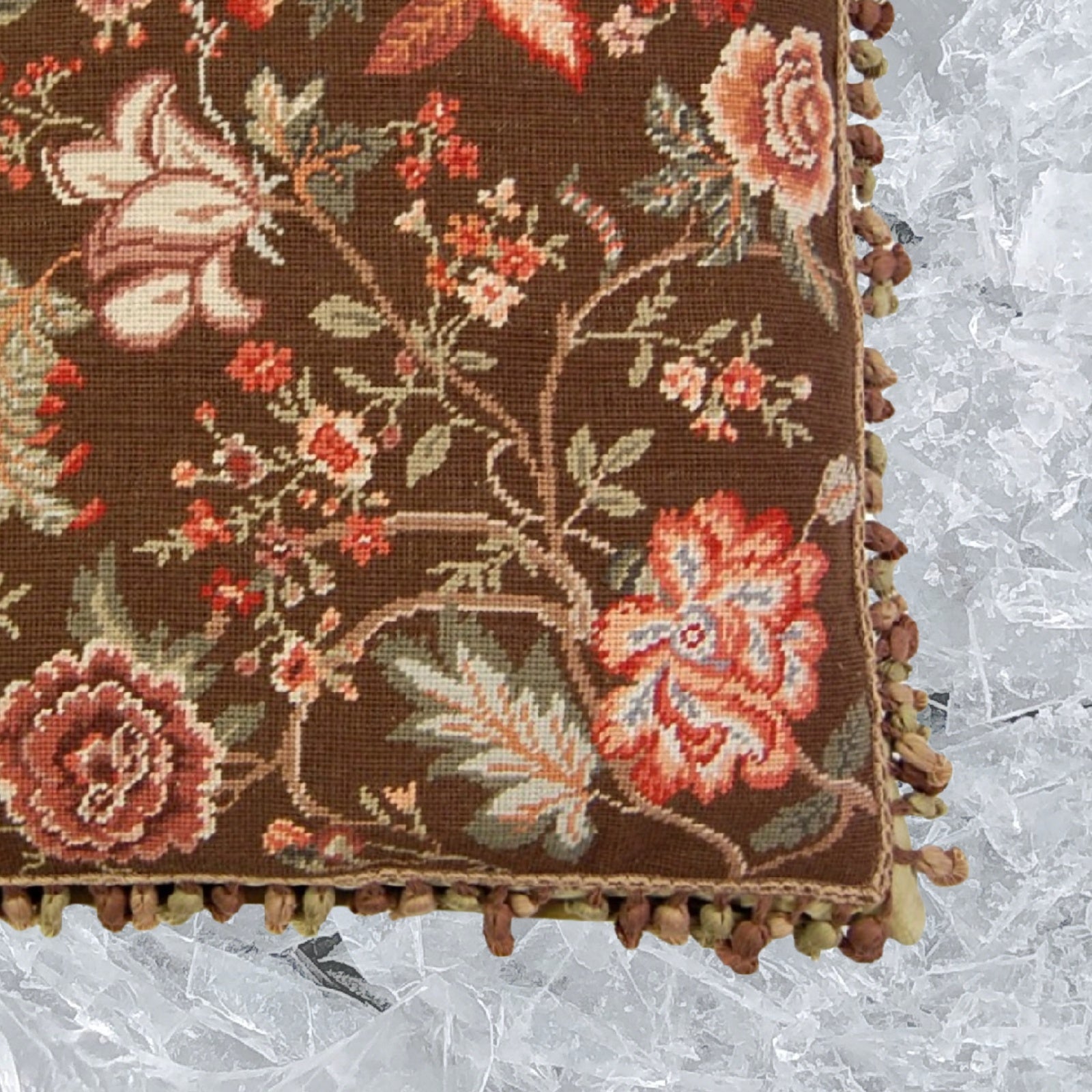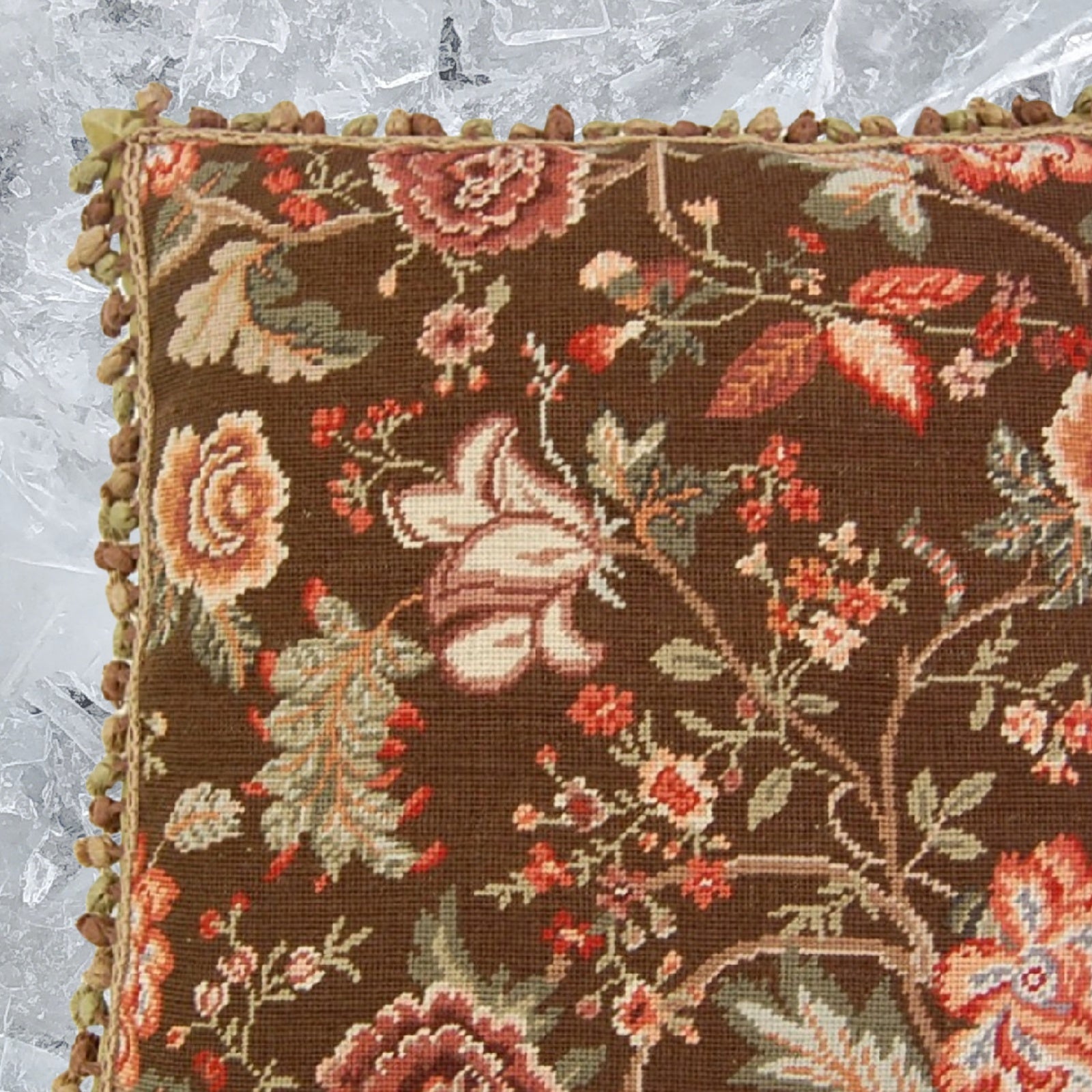 Handmade Wool Needlepoint Pillow Cover - Decorative Throw Cushion Cover - Vintage Floral Embroidery Design tropical floral with 3 color tassel