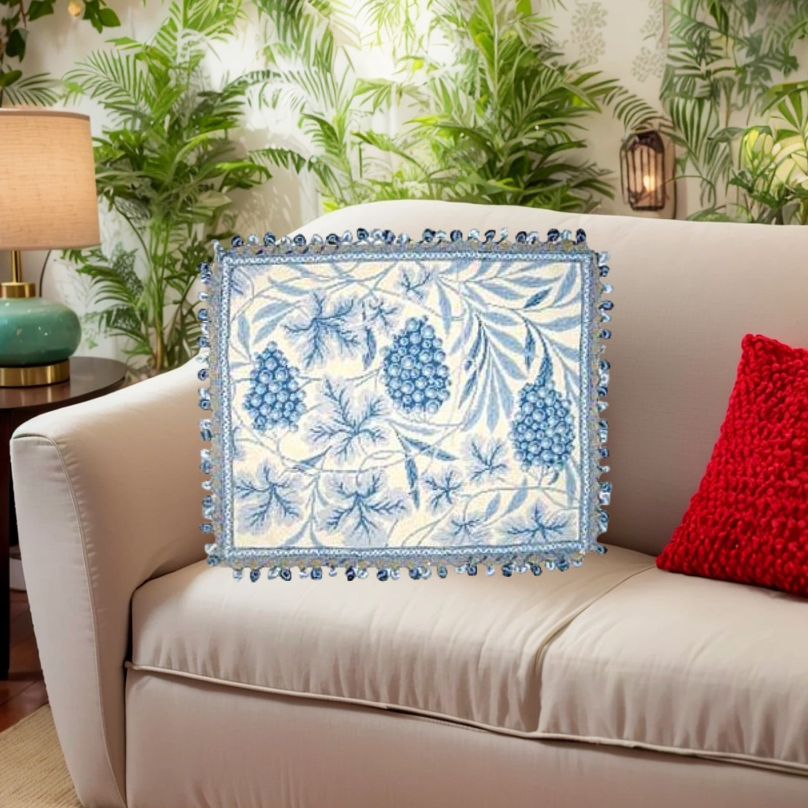 Handmade Wool Needlepoint Pillow Cover - Decorative Throw Cushion Cover - Vintage Floral Embroidery Design William Morris grapes with tassels